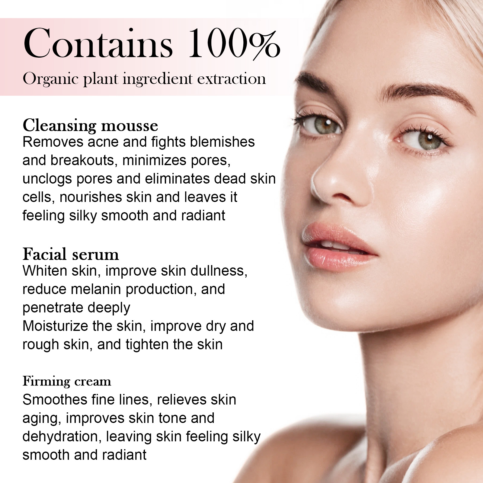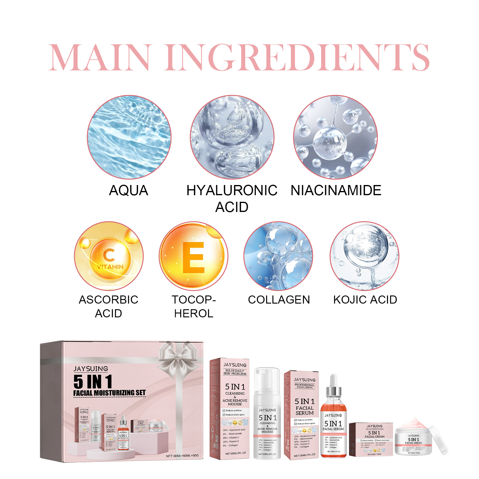 Our 5-in-1 facial moisturizing set contains hyaluronic acid, niacinamide, and vitamin c. It can help manage and relieve itching, burns, peeling and pain caused by seborrheic dermatitis, folliculitis and psoriasis. It helps to eliminate the recurrence of seborrheic dermatitis and psoriasis and restore natural skin. Its use method is very simple: cleansing mousse: use once in the morning and evening, evenly apply, massage with water after massage, serum: 1-2 times a day, massage until absorbed after use, cream: use in the morning and evening, massage until absorbed. And skin care.