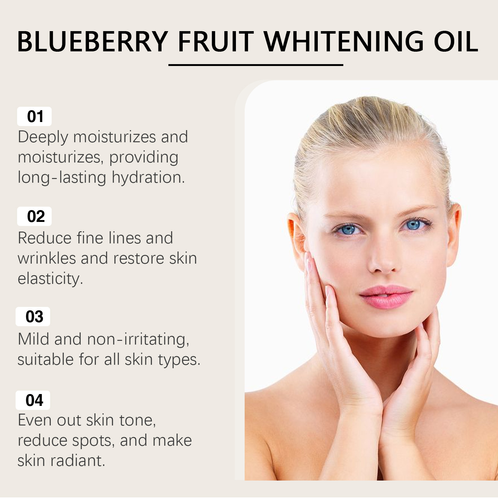 Our Blueberry Essence Oil contains blueberry fruit extract and rose oil. It nourishes deeply, locks in moisture and moisturizes for a long time. Enhances skin clarity and leaves skin glowing. The way to use it is simple: clean and dry facial skin. Apply a good amount of oil to your face. Gently massage until absorbed. And can deeply repair, fade fine lines and wrinkles, restore smooth skin.