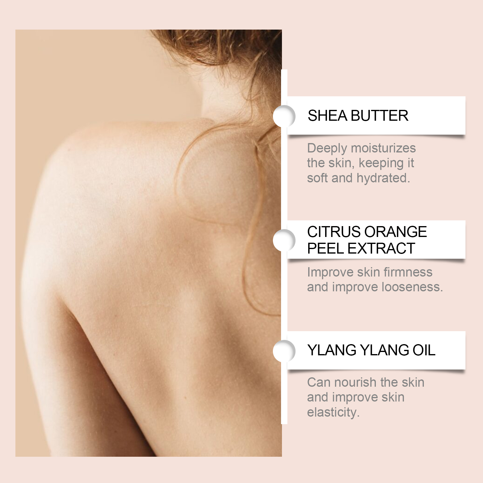 Our Citrus Body Butter Moisturizer contains shea butter, citrus orange peel extract, ylang Ylang flower oil. It deeply moisturizes the skin and keeps it soft and hydrated. Improves skin firmness and relaxation. Its application method is simple: 1. Clean the skin and keep it dry. 2. Apply proper amount of the product to the whole body. 3. Gently massage until absorbed. Improves skin firmness, leaves skin soft and firm. The skin is soft and delicate, giving a feeling of radiance.