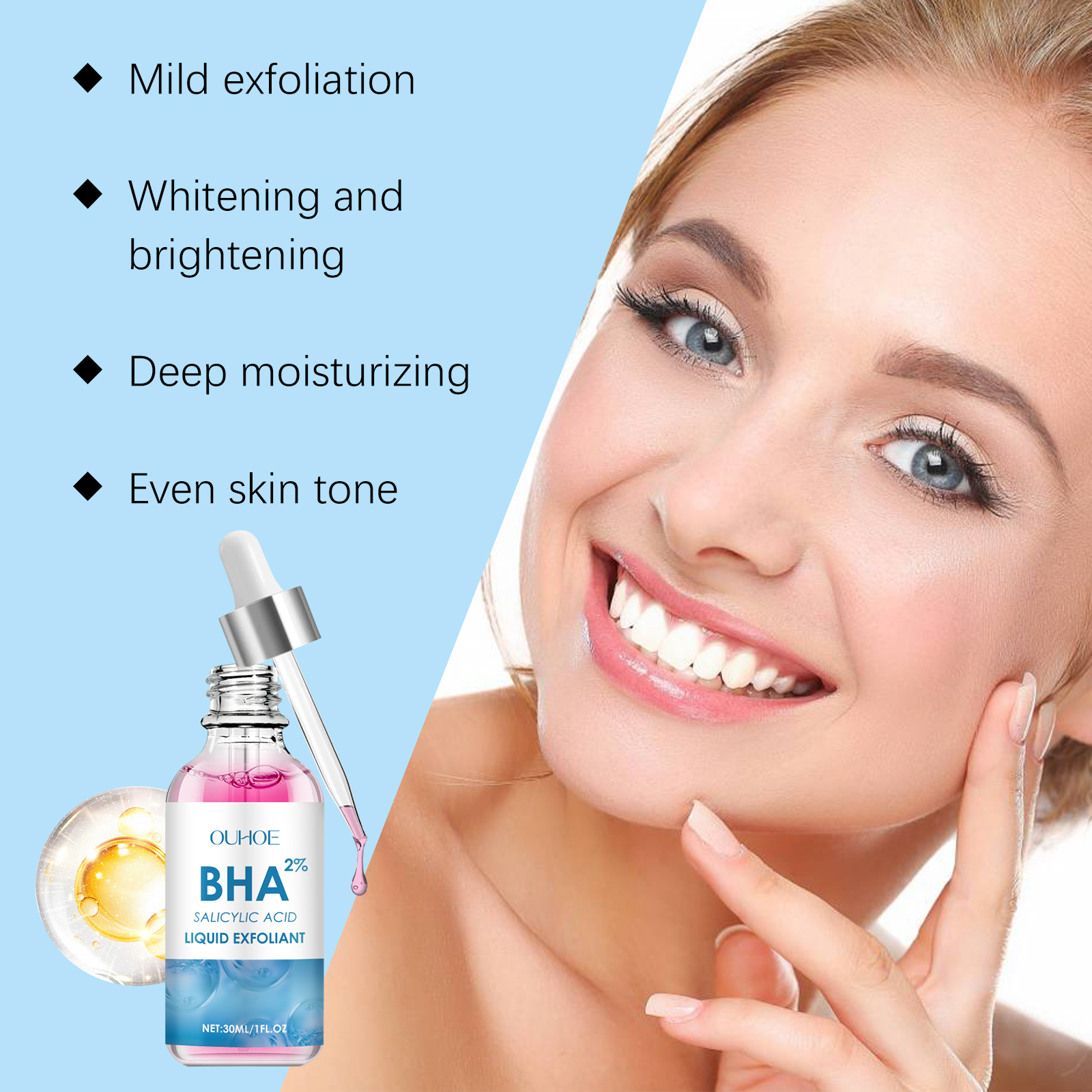 Our exfoliating serum contains vitamin C(ascorbic acid), glycerin. It can help remove old dead skin cells and make the skin smoother and brighter. Its application method is very simple: clean the facial skin to keep the skin dry, apply appropriate amount of this product evenly on the facial skin, gently massage until completely absorbed. And can remove old dead skin cells, help improve skin texture, make skin smooth.