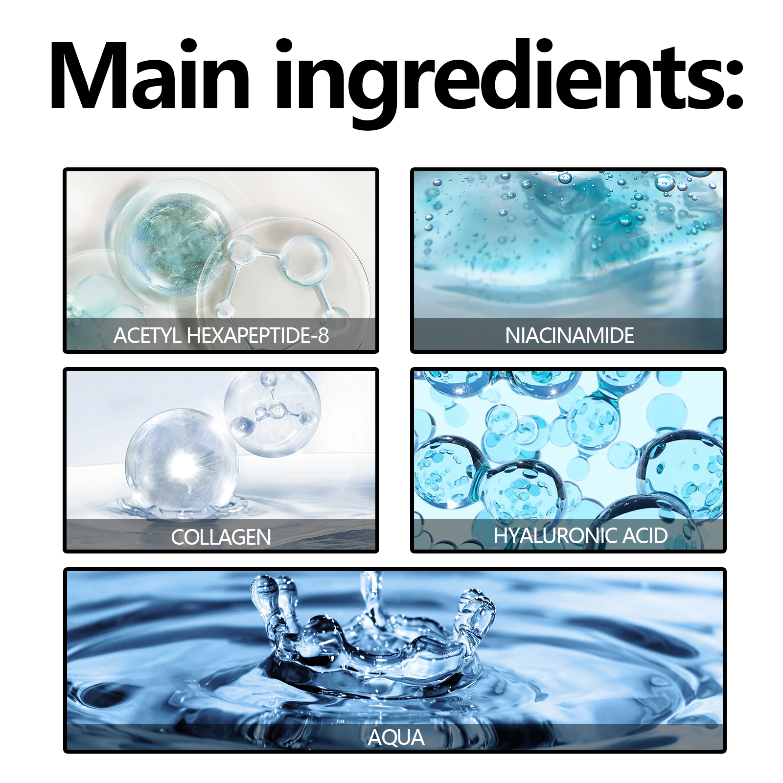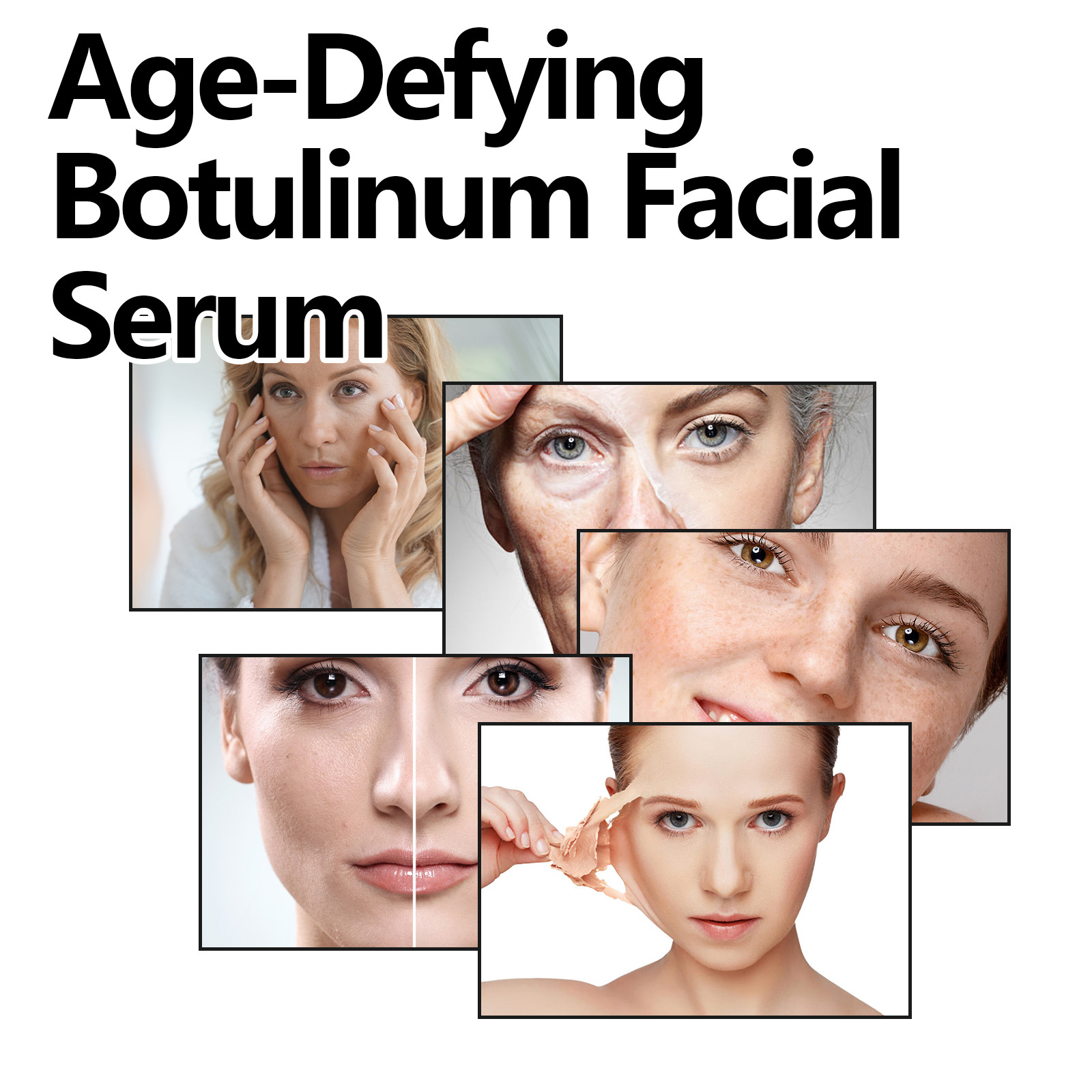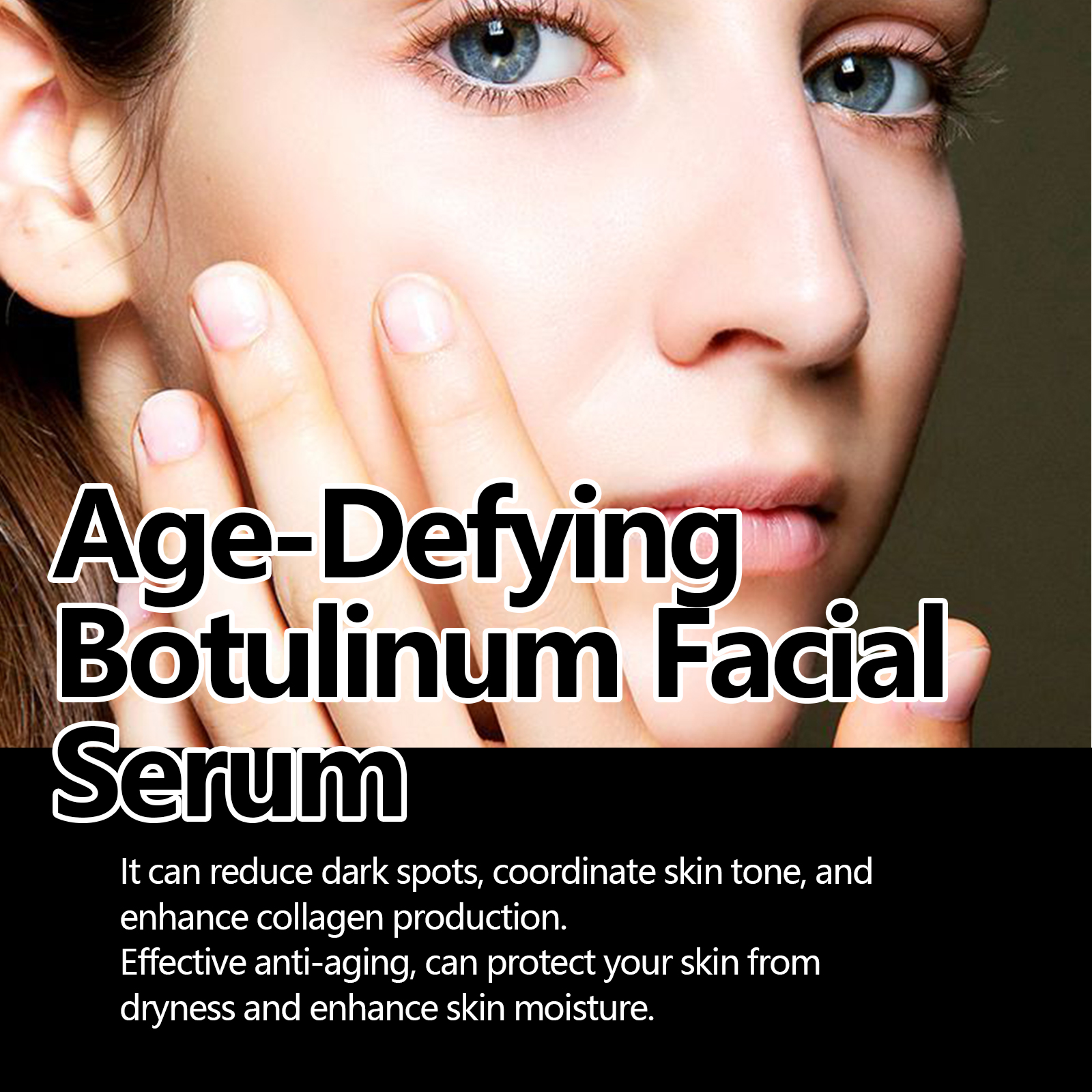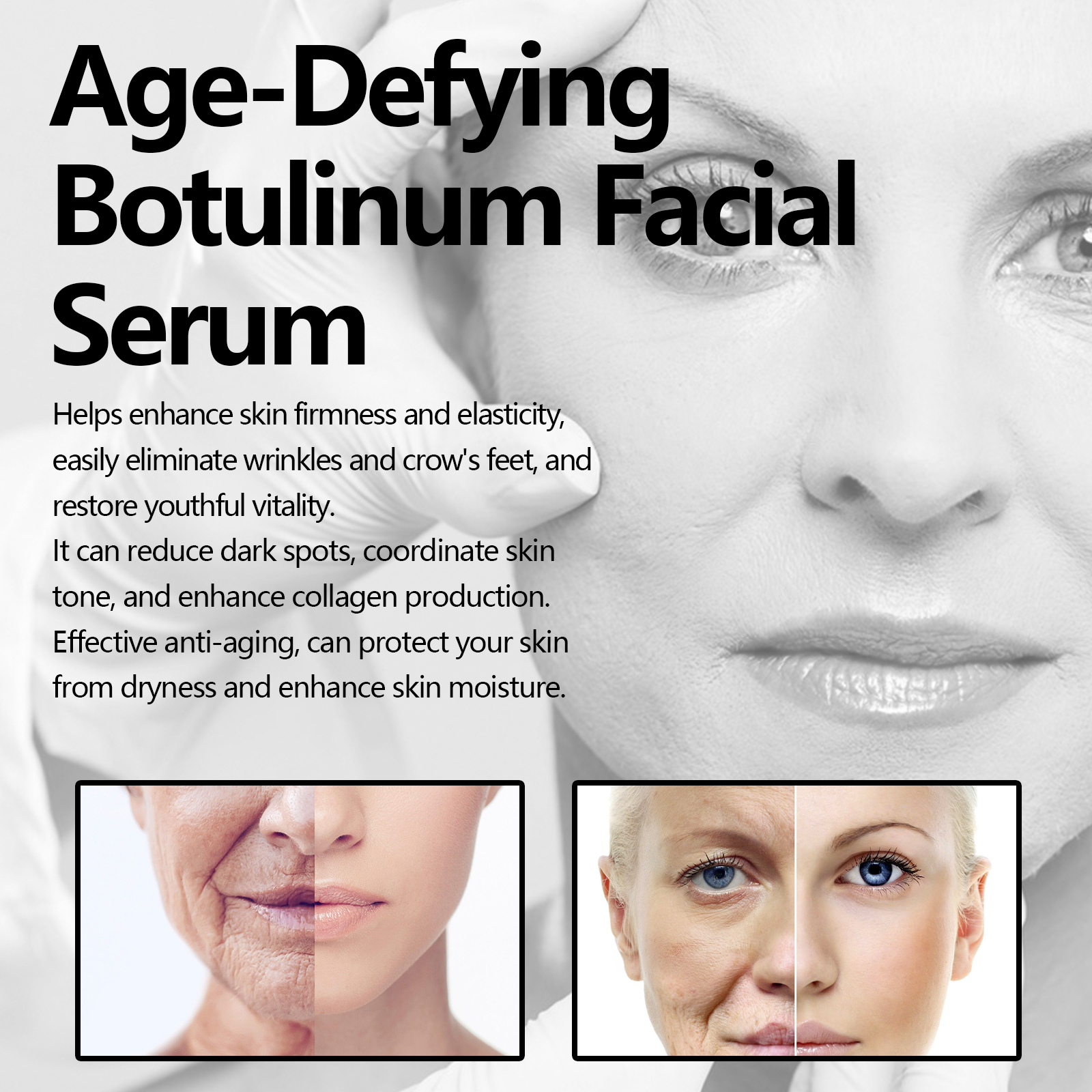 Our Age-Defying Botulinum Facial Serum contains Acetyl Hexapeptide-8, Niacinamide, Collagen. It can help enhance skin firmness and elasticity, easily eliminate wrinkles and crow's feet, restore youthful vitality, reduce dark spots, even out skin tone, enhance collagen production, effectively combat aging, protect skin from dryness, and enhance skin moisture. Its application method is very simple: use a dropper to take appropriate amount of this product evenly drop on the face skin, gently massage until completely absorbed. It can effectively combat aging, reduce fine lines and wrinkles, and tighten the skin.