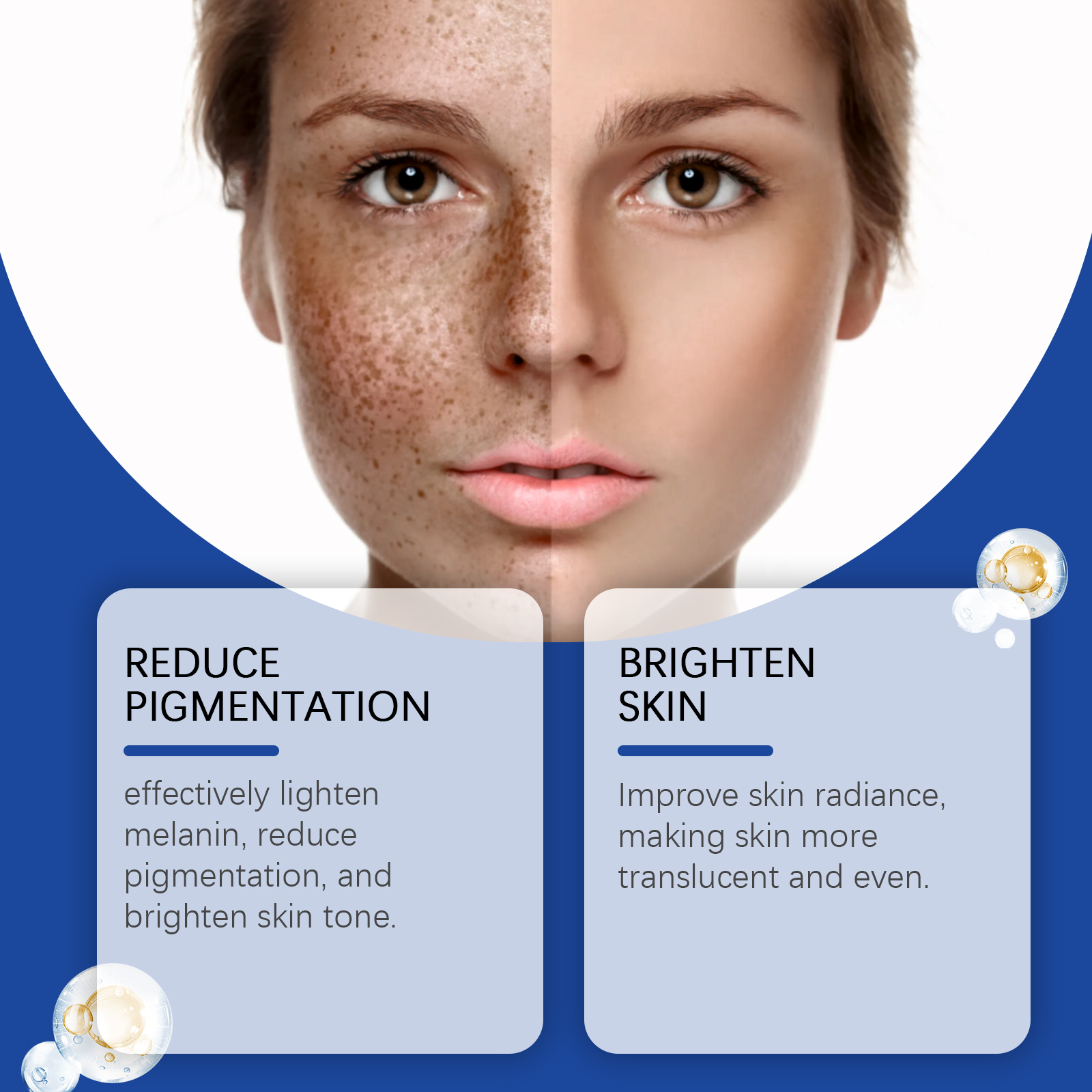Our face serum contains tocopherol (vitamin E), acetyl tripeptide-1. It can remove dullness, restore skin shine, and make skin glow. The way to apply it is simple: thoroughly clean the skin and dry it first. Apply appropriate amount of this product evenly on the face. Gently massage until fully absorbed. And can repair damaged skin, promote cell regeneration, improve skin health.