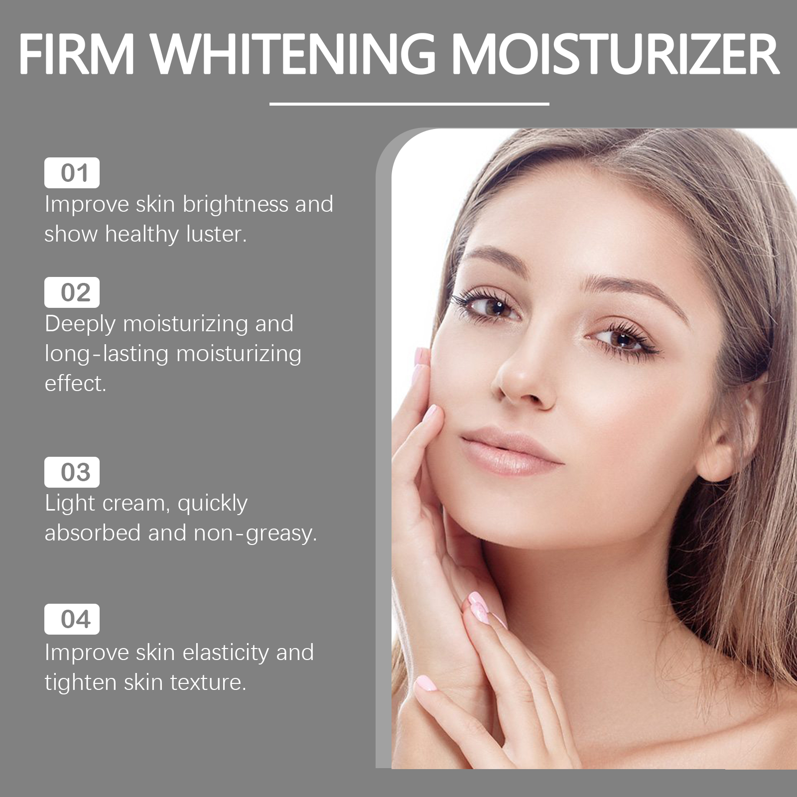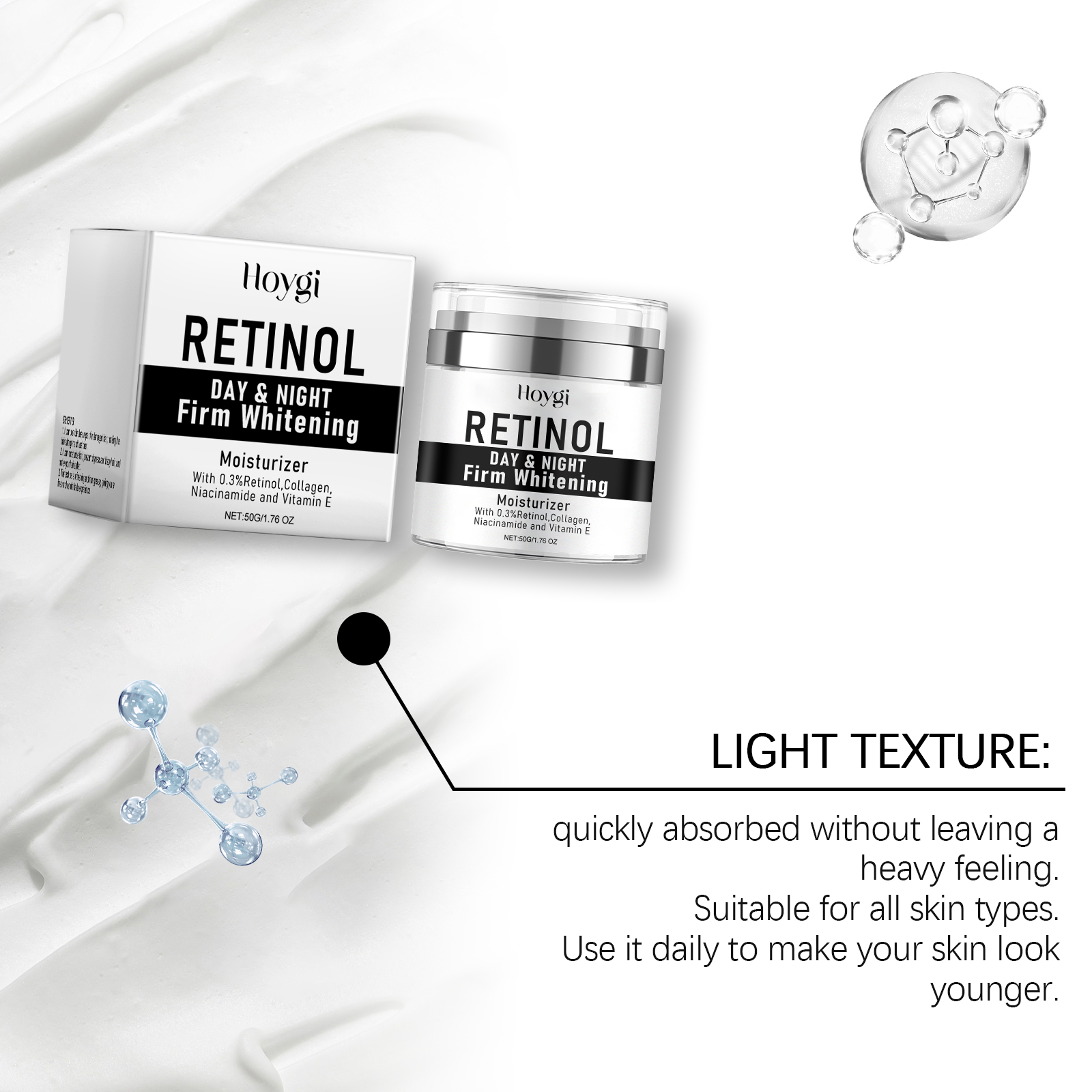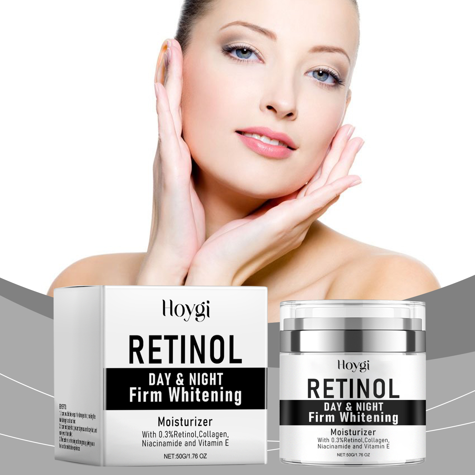 Our facial moisturizer contains retinol, collagen and niacinamide. It can effectively resist daily environmental stress, promote smooth skin and reduce dryness. Its application method is simple: 1. Clean facial skin and keep it dry. 2. Apply appropriate amount of the product evenly on the face. 3. Gently massage until fully absorbed. Instantly awaken skin vitality. Reduce dry lines and improve softness and smoothness.