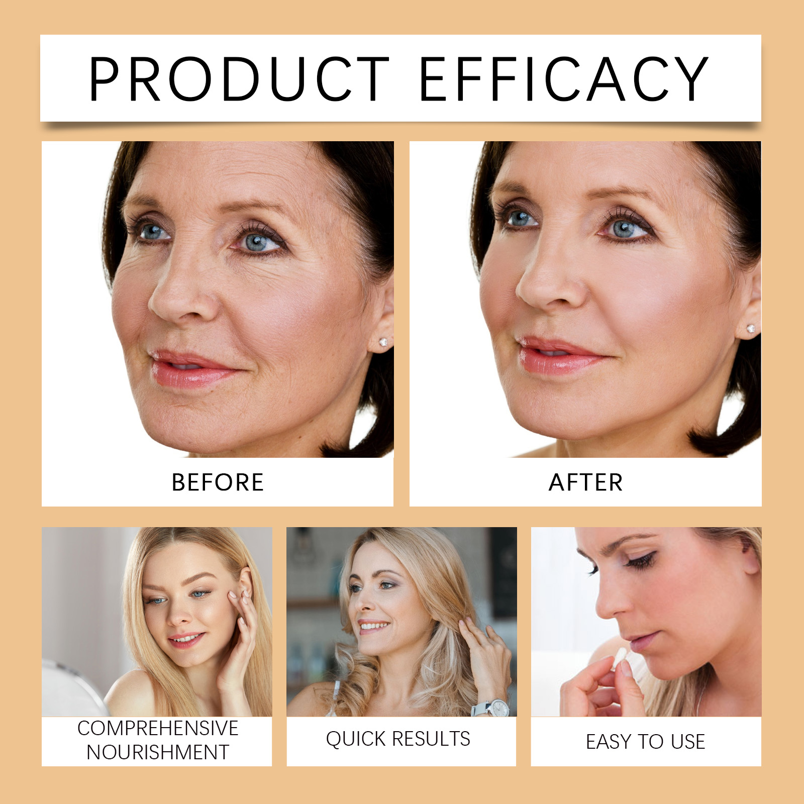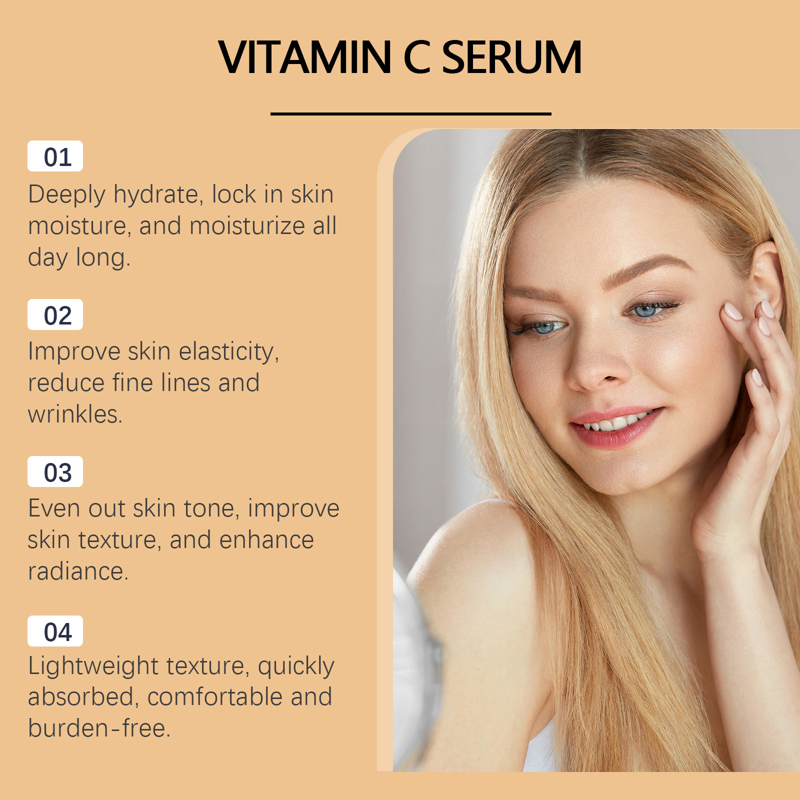 Our face serum contains vitamin E (tocopherol) and Centella asiatica extract. It can significantly improve skin firmness and make skin more elastic and rejuvenated. Its use method is very simple: clean your face, take appropriate amount of this product evenly spread on the face, gently massage in circles to promote absorption. It can effectively lock in moisture and help the skin retain moisture for a long time.