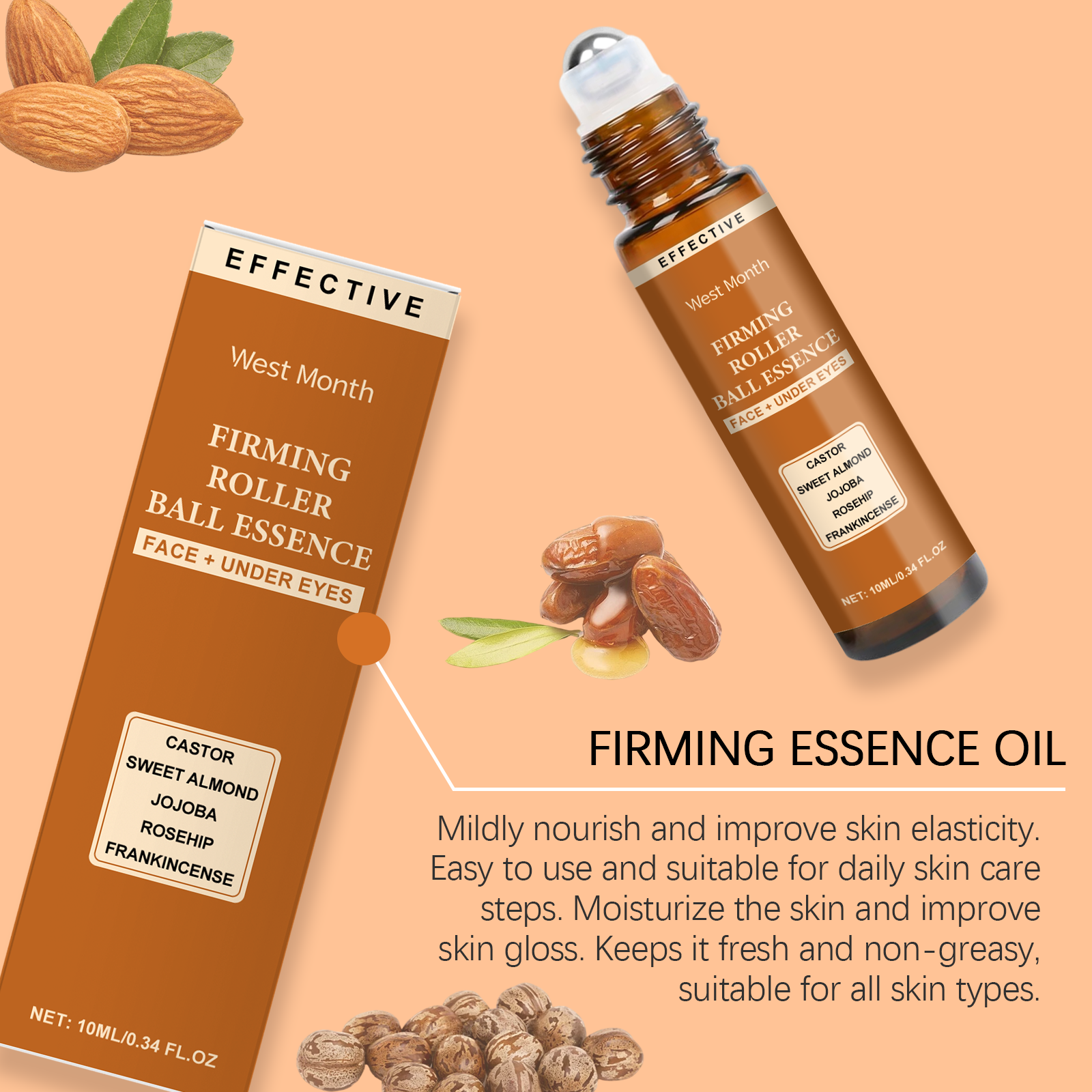 Our firming ball essence contains castor oil, almond oil and Jojoba oil. It can help tighten the skin and enhance the facial contours. Reduces fine lines and makes skin smoother. The way to use it is simple: 1. Clean your face and keep it dry. 2. Apply the product evenly on your face and under your eyes. 3. Gently massage until absorbed. Keep skin hydrated and reduce dryness. Easy to use, easy to massage skin. Gentle and nourishing, improves skin elasticity. Easy to use and suitable for daily skincare steps.