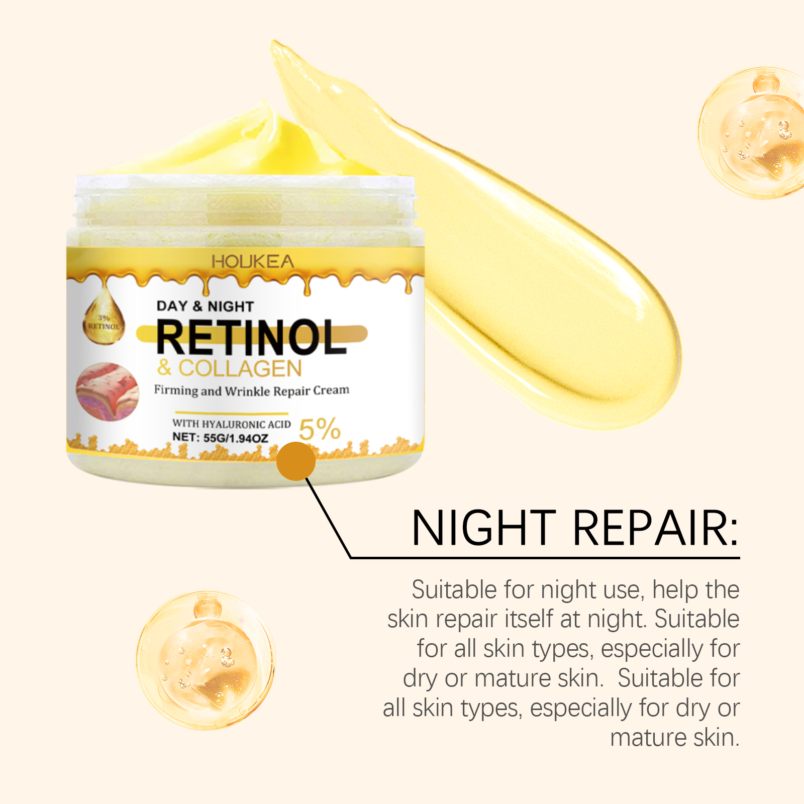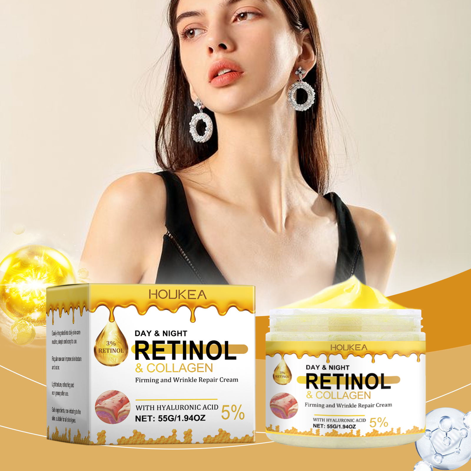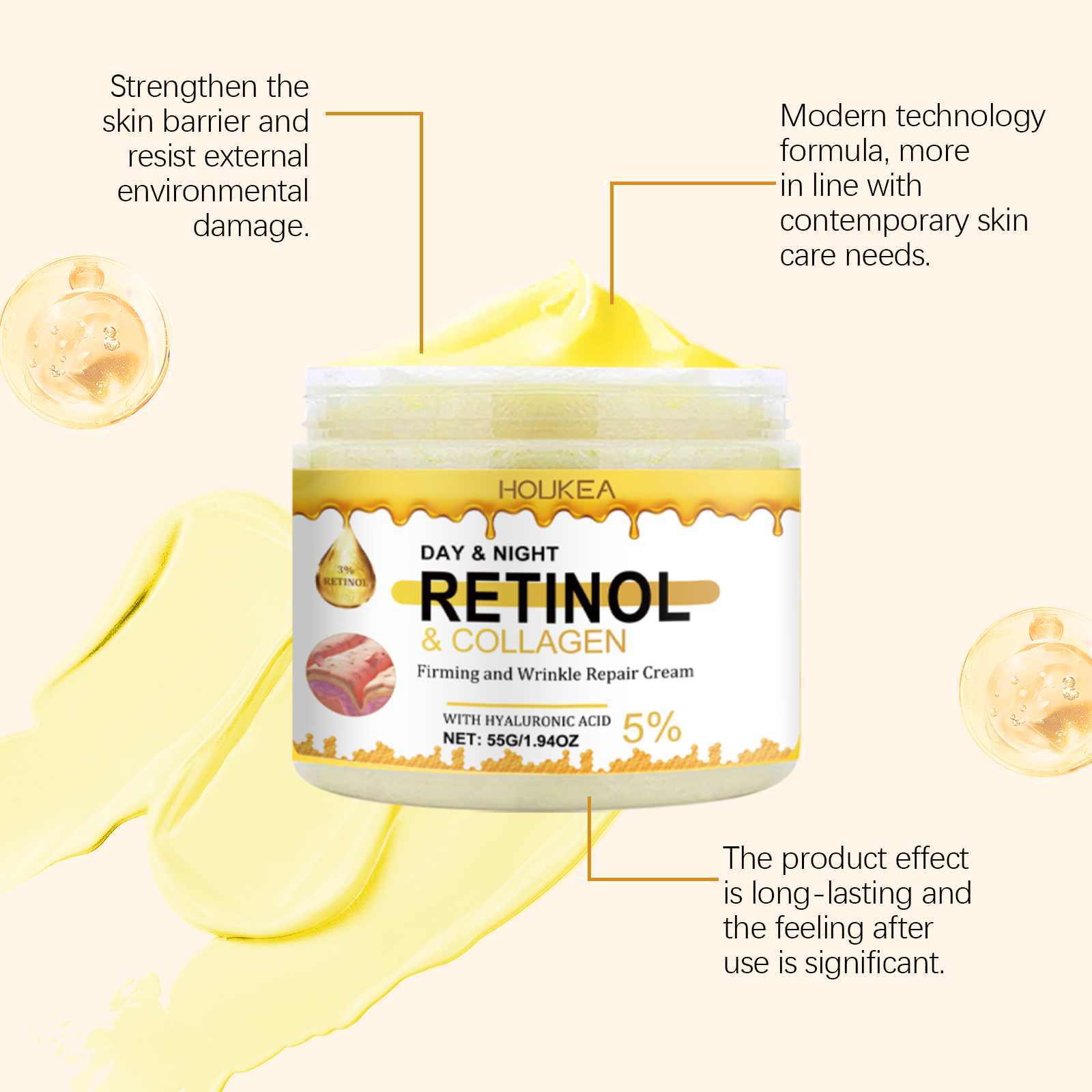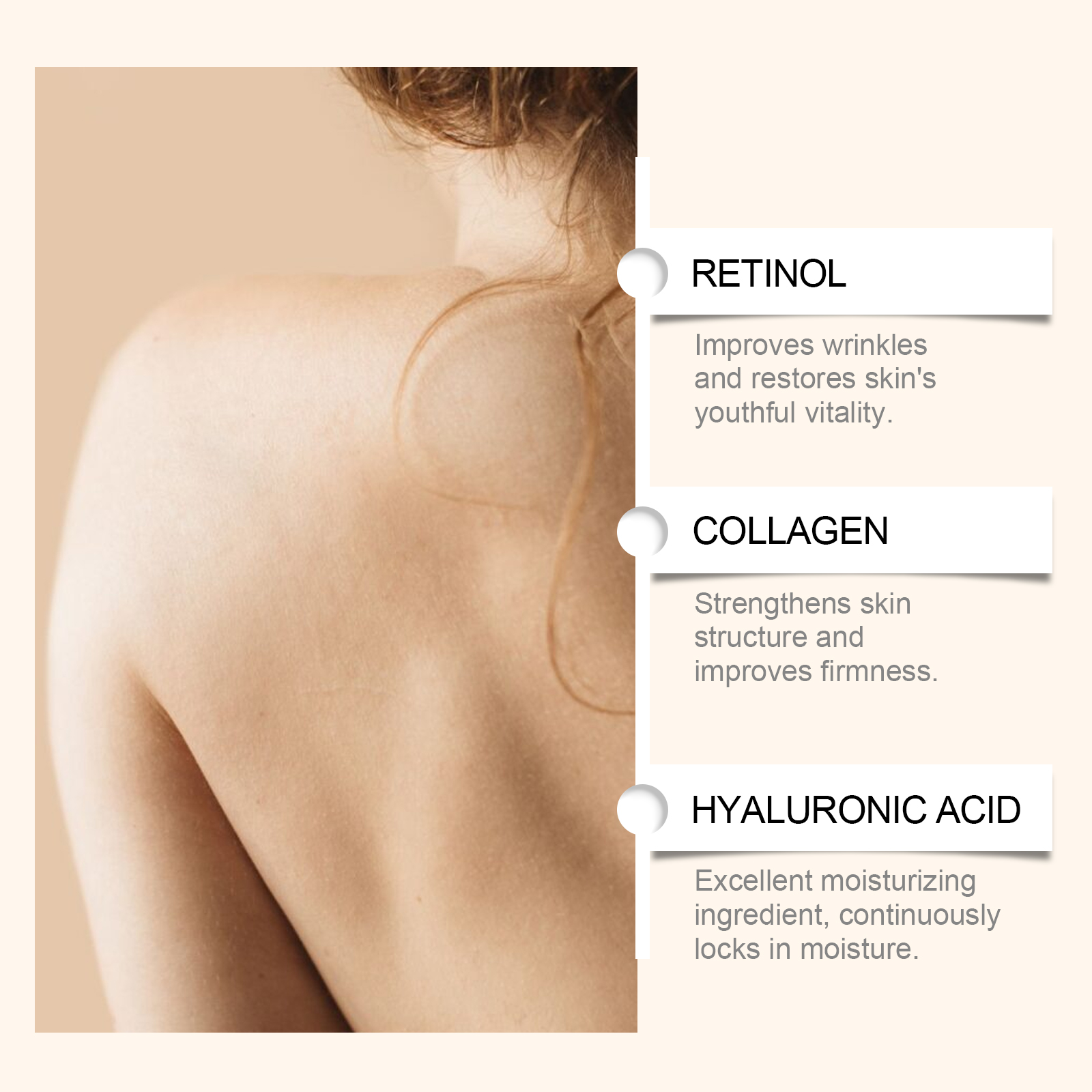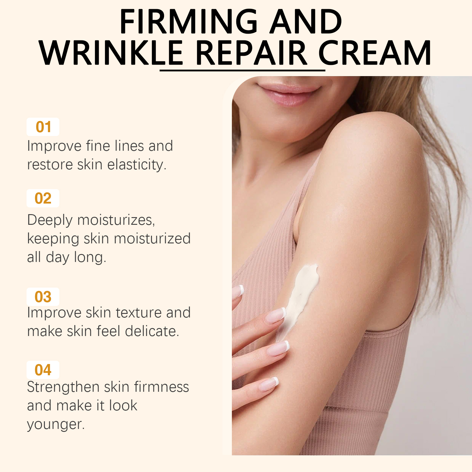 Our firming moisturizer contains retinol, collagen, and hyaluronic acid. It can improve skin elasticity, reduce fine lines, and make skin firmer. No heavy metals, no sensitizing fragrance, safer to use. The way to use it is simple: 1. Clean the body skin and keep it dry. 2. Apply appropriate amount of the product evenly on the neck, arms, chest and other skin parts required by the body. 3. Gently massage until completely absorbed. Continuous release of moisturizing ingredients to ensure that the skin is moisturized all day without drying. Light texture, easy to be absorbed by the skin, not greasy. With daily use, the skin continues to improve and the texture is better.