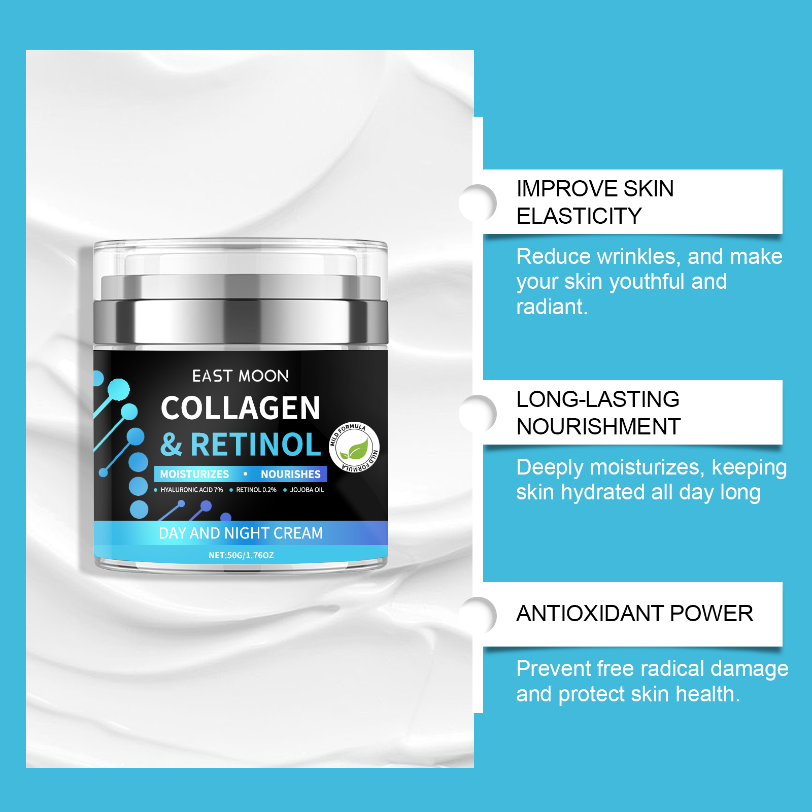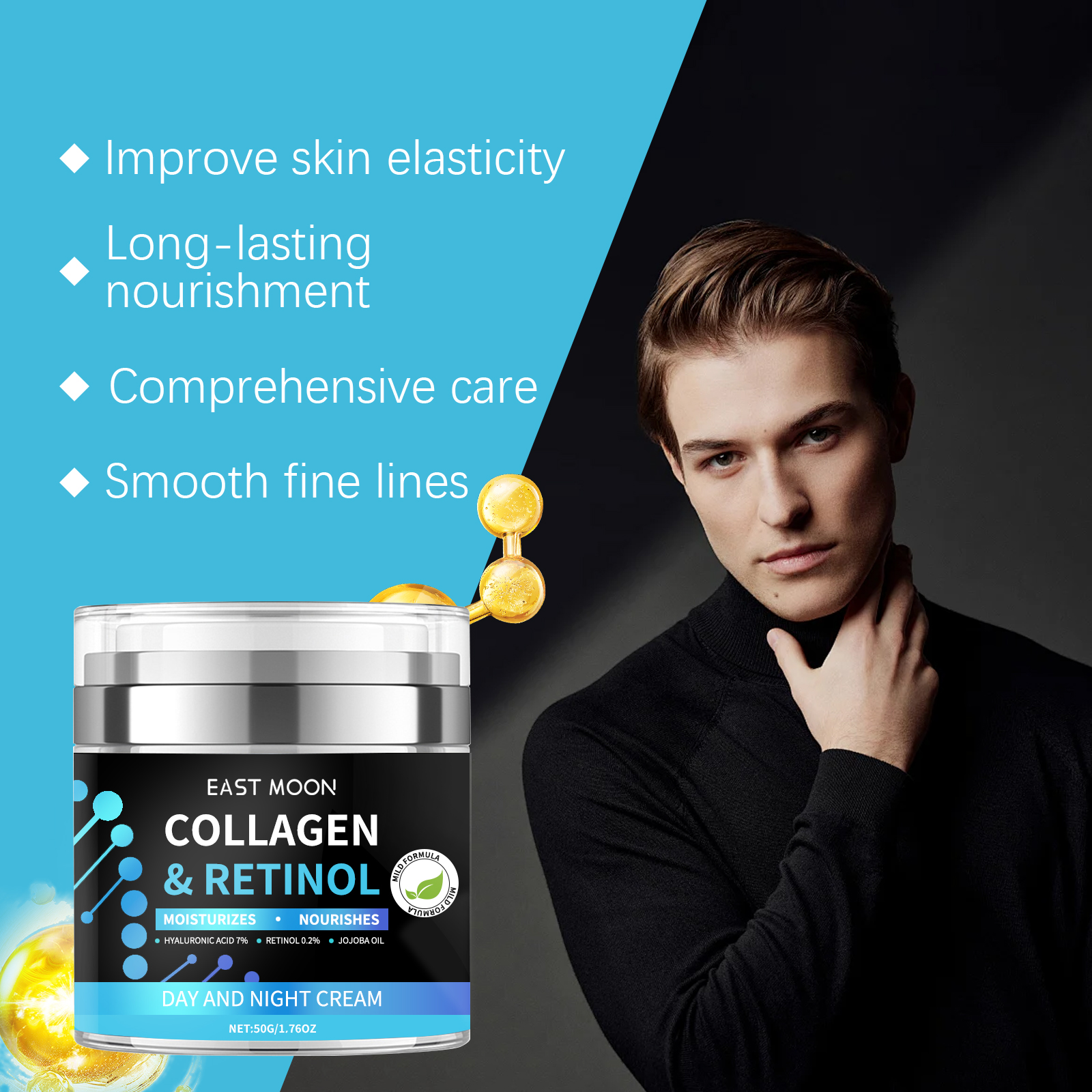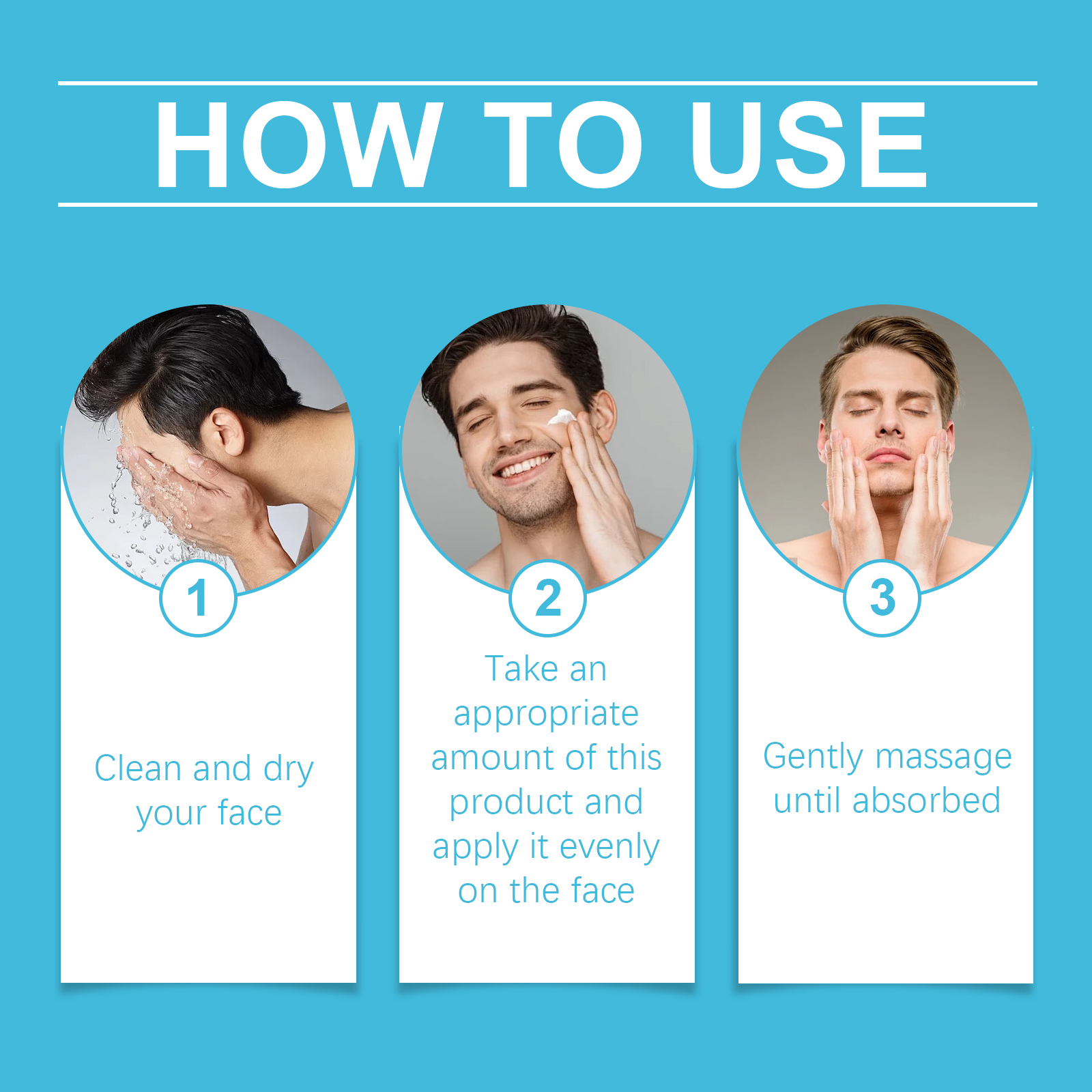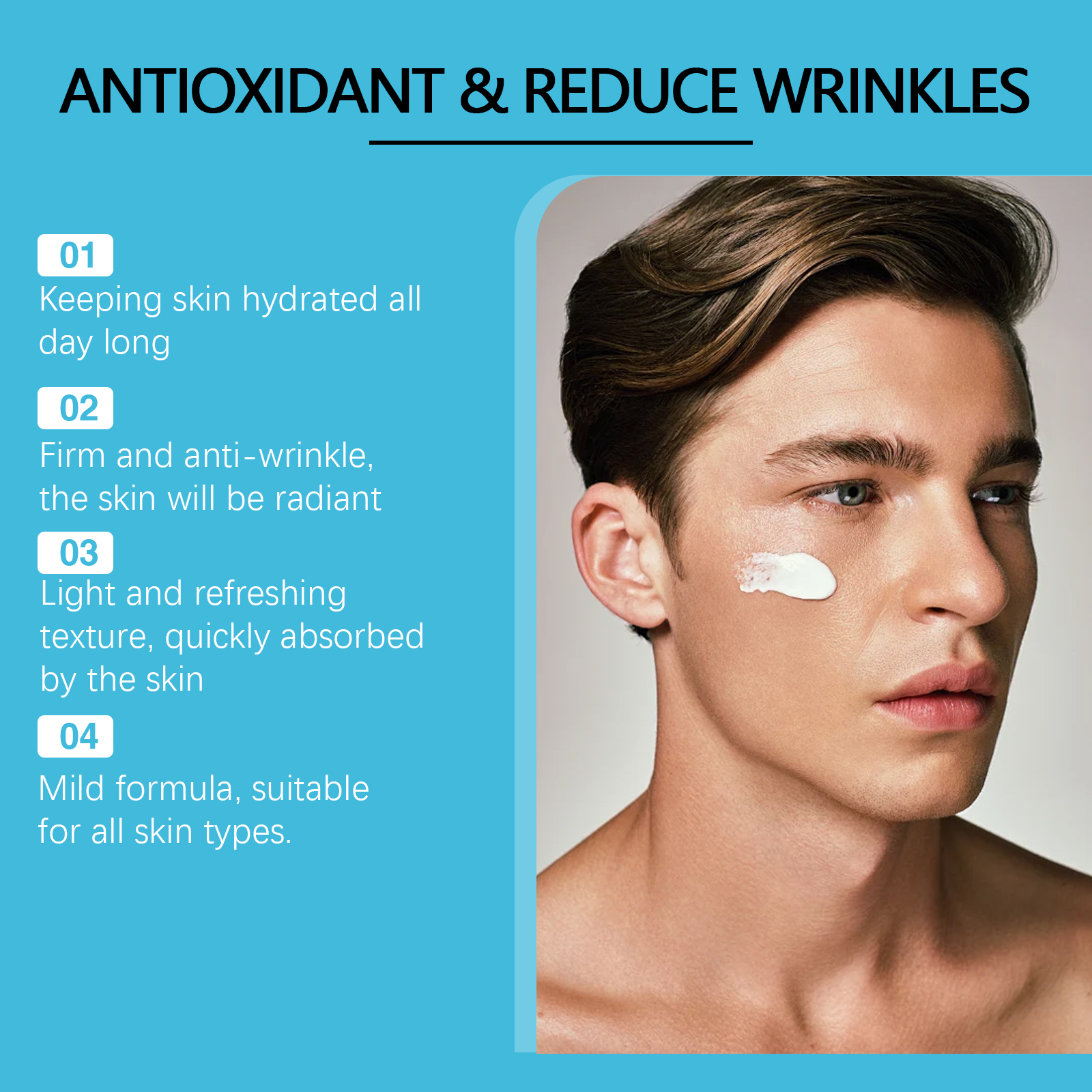 Our men's moisturizer contains hyaluronic acid and retinol. It can resist the damage of the external environment, delay skin aging, deeply moisturize, and keep skin hydrated throughout the day. Its application method is very simple: clean and dry the face, apply appropriate amount of this product evenly on the face, gently massage until absorbed. And can effectively improve the elasticity of the skin to reduce wrinkles, make the skin youthful and radiant.