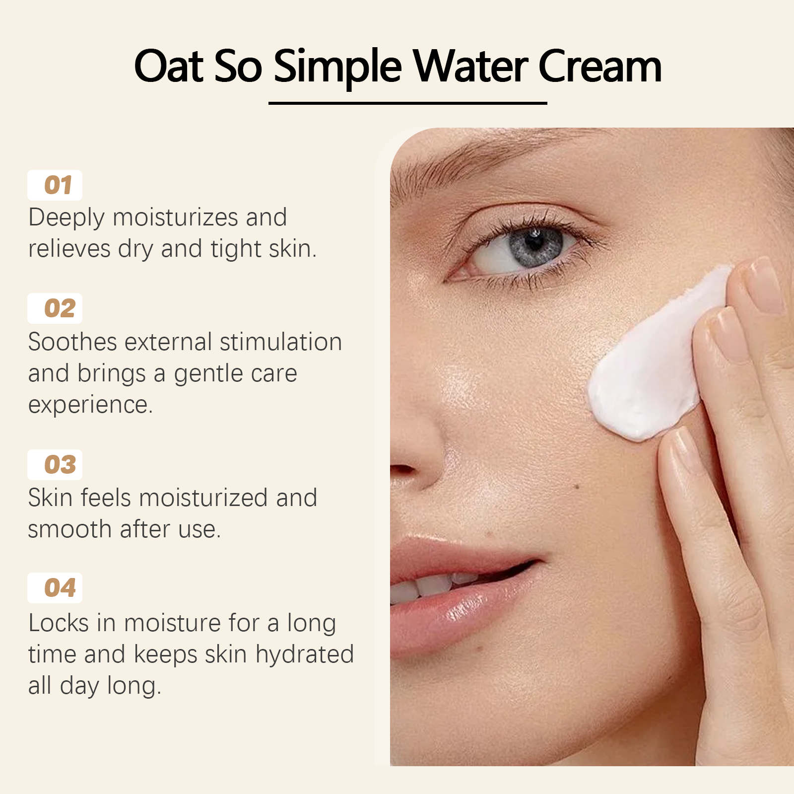 Our oatmeal moisturizer contains vitamin E(tocopherol), trehalose. It helps to lock in moisture, providing long-lasting moisture and keeping skin moist without drying out. Its use method is very simple: after cleansing, take a proper amount of cream, evenly spread on the face. Massage gently in circular motions until fully absorbed. And it can make the skin feel smoother and more delicate after use, and improve the skin gloss.