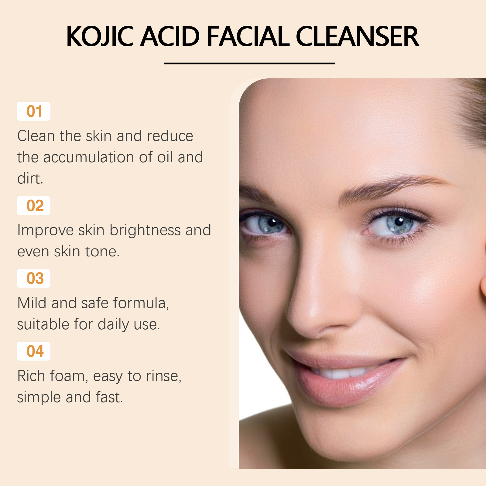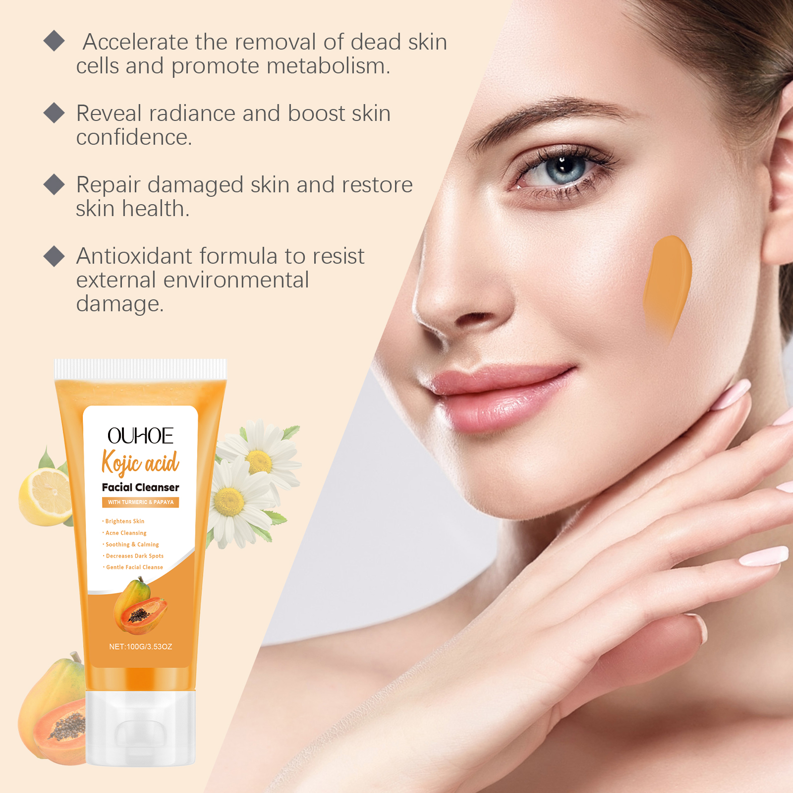 Our papaya cleanser contains chamomile extract, lemon extract. It can improve skin tone and restore skin glow. Its application method is very simple: clean and moisturize the facial skin, squeeze out the right amount of cleanser, gently massage the face, wash the face with water until the face is clean. And removes dirt and grease.