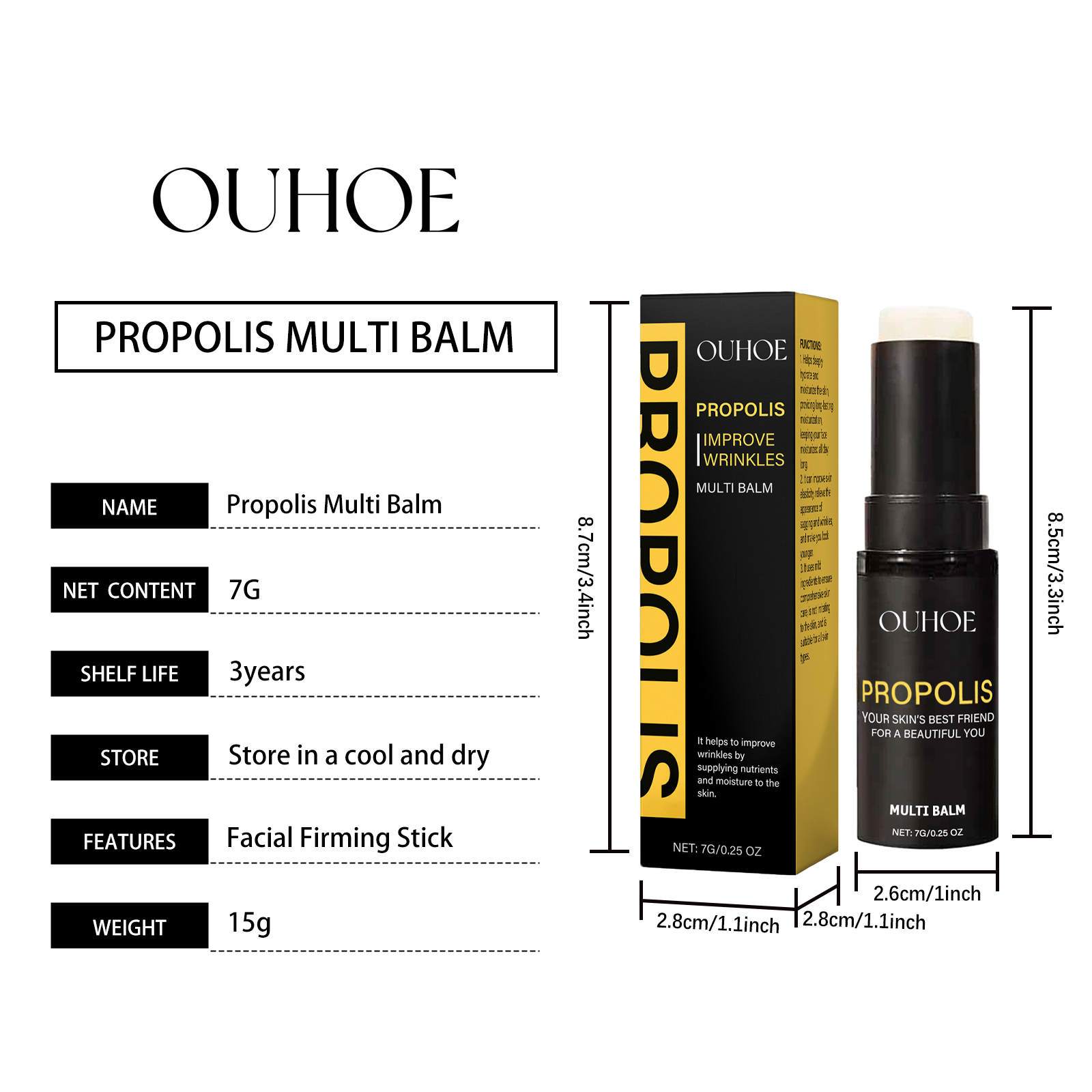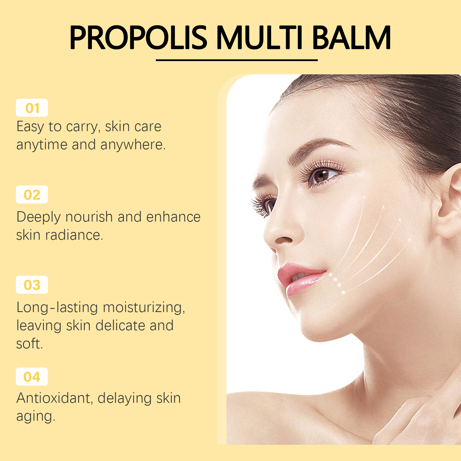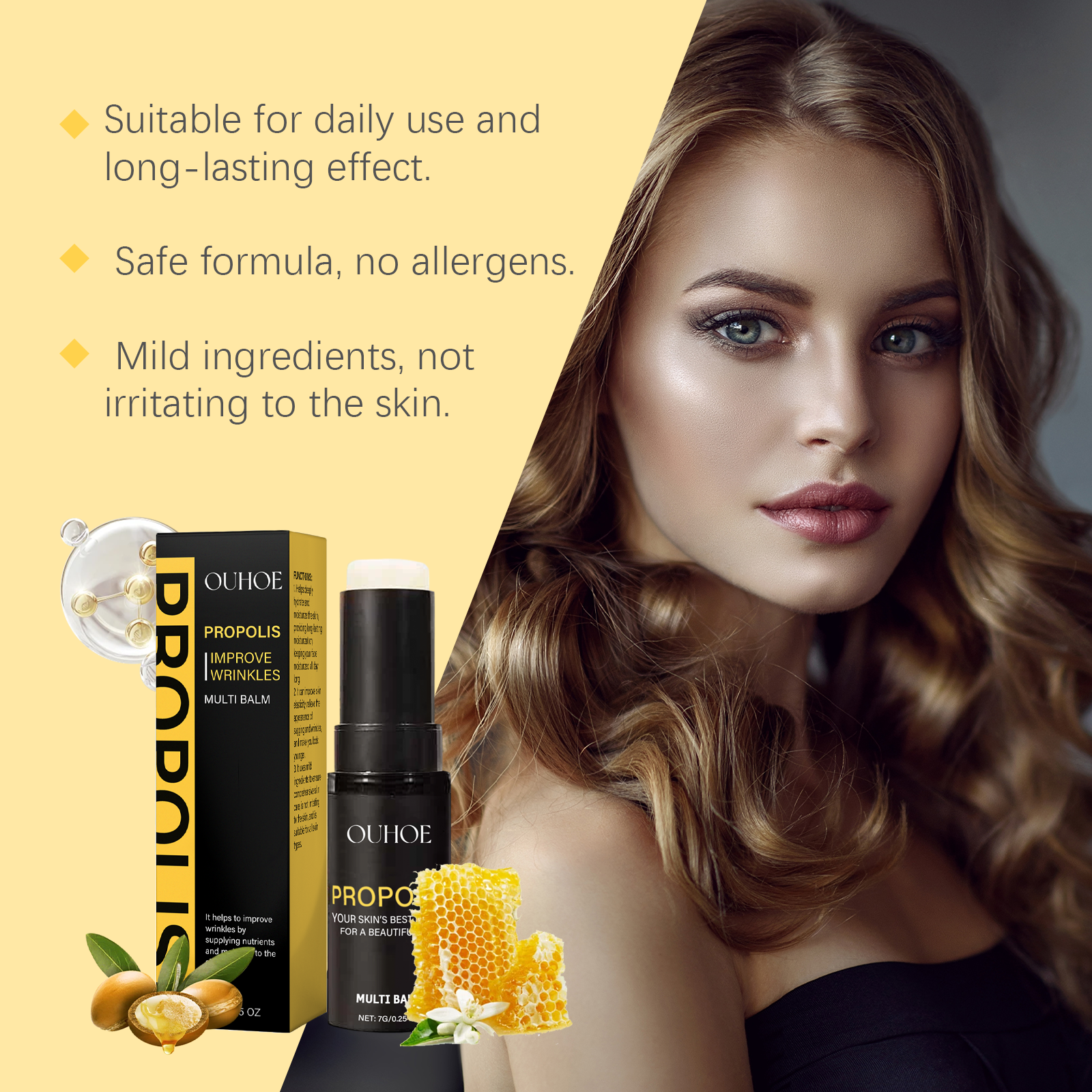 Our propolis eye moisturizer bar contains argan kernel oil and tocopherol. It keeps your skin hydrated for a long time. Its application method is simple: clean facial skin, keep smooth, open the bottle cap, screw on the product, apply directly to facial skin, gently massage until fully absorbed. And can provide lasting nutrition for the skin.