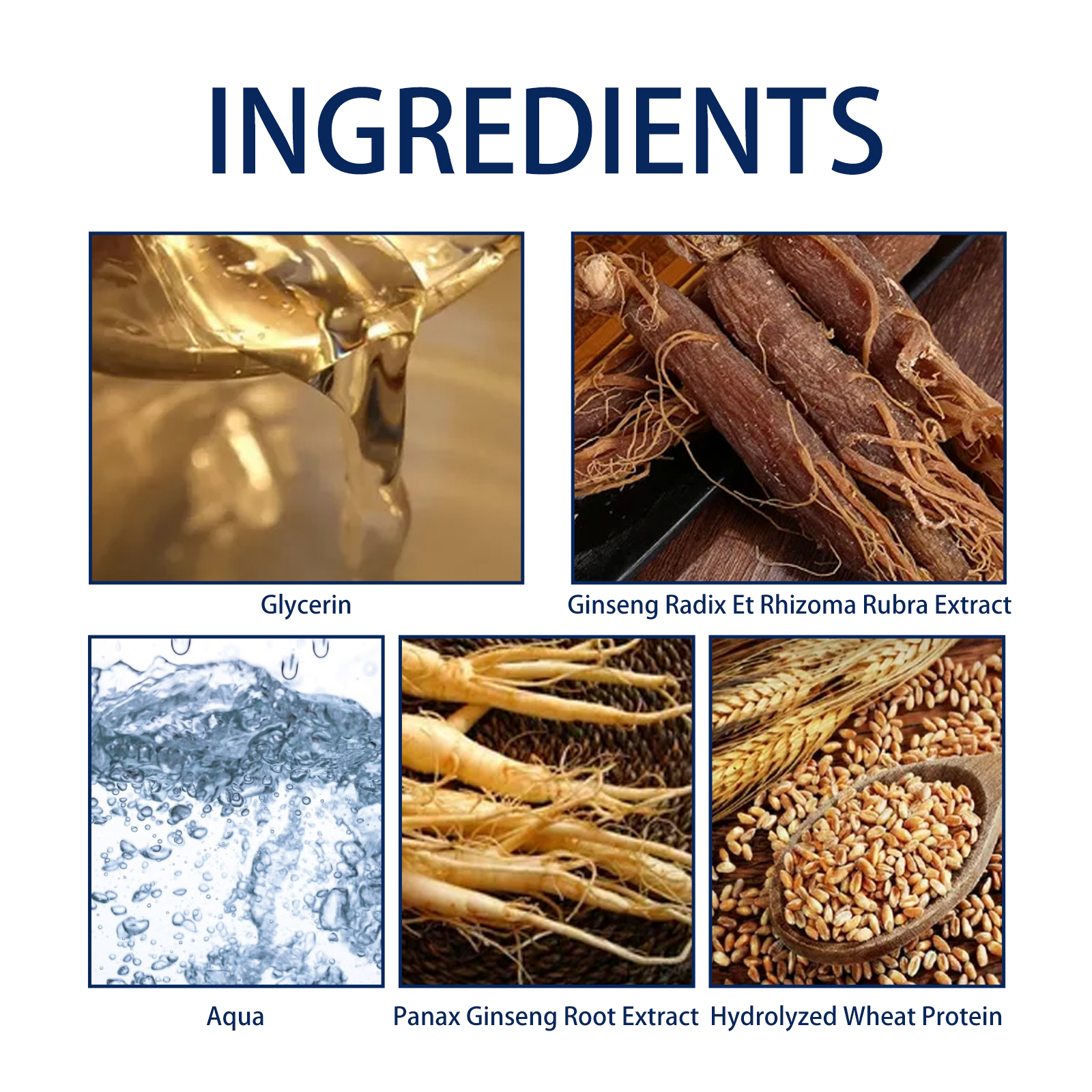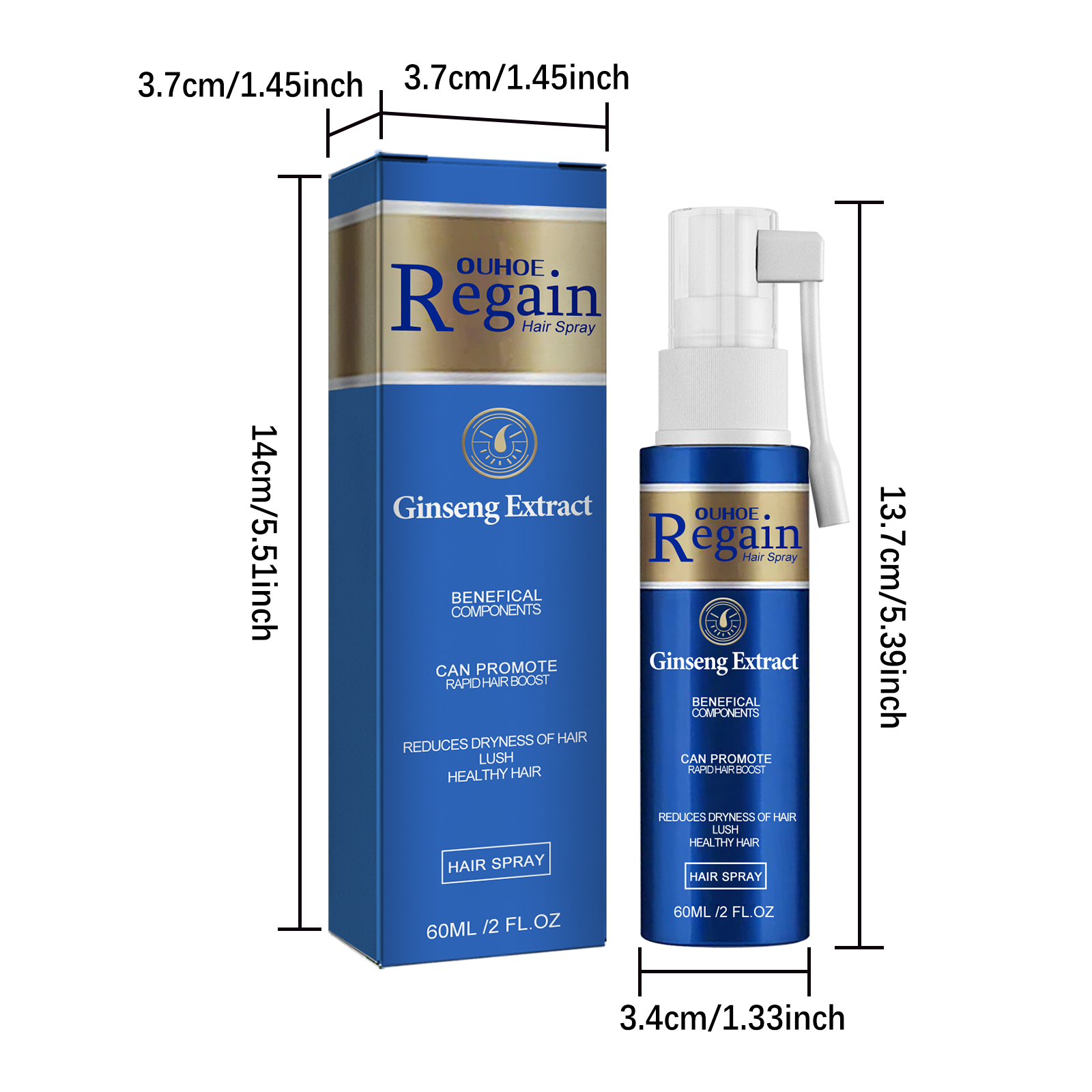 Our Regain Hair Spray contains Glycerin, ginseng radix et rhizoma rubra extract, ginseng root extract. It can promote healthy hair growth, strengthen hair roots, improve hair quality, repair damaged hair, and prevent hair loss. Its use method is very simple: place the nozzle about 10 cm away from the hair, spray the product evenly on the hair, and gently massage until it is completely absorbed. It can promote the growth of new hair, making hair healthier and thicker.