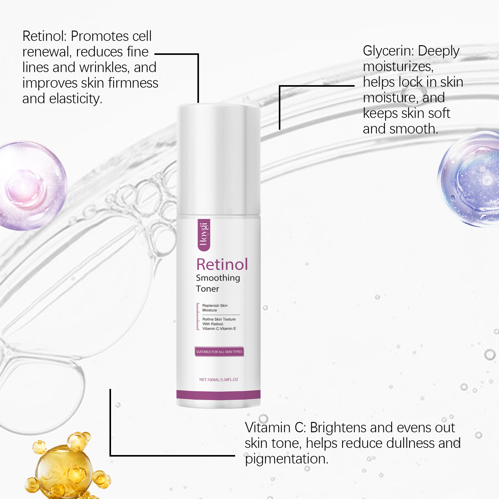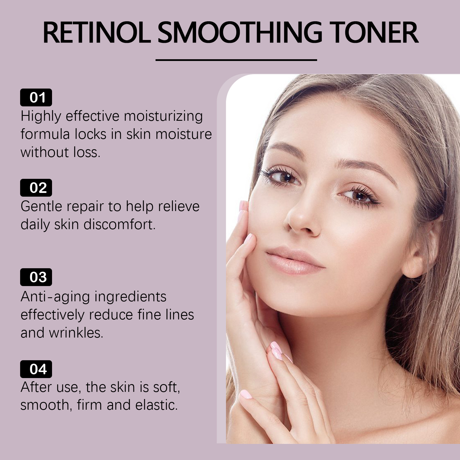 Our retinol moisturizing toner contains vitamin E(tocopherol), vitamin C(ascorbic acid), and glycerin. It deeply moisturizes the skin, helping to lock in moisture and keeping it soft and hydrated throughout the day. Its use is simple: 1. Wash your face and keep it dry. 2. Apply appropriate amount to face evenly. 3. Gently massage with a round cotton swab until completely absorbed. It helps to relieve skin discomfort, reduce the damage caused by external stimuli, and improve skin comfort.
