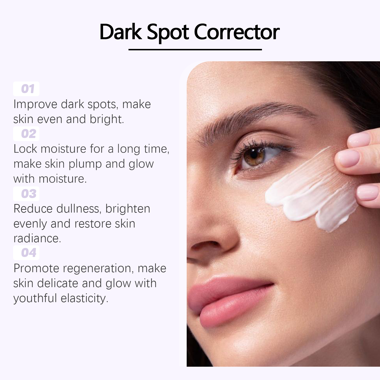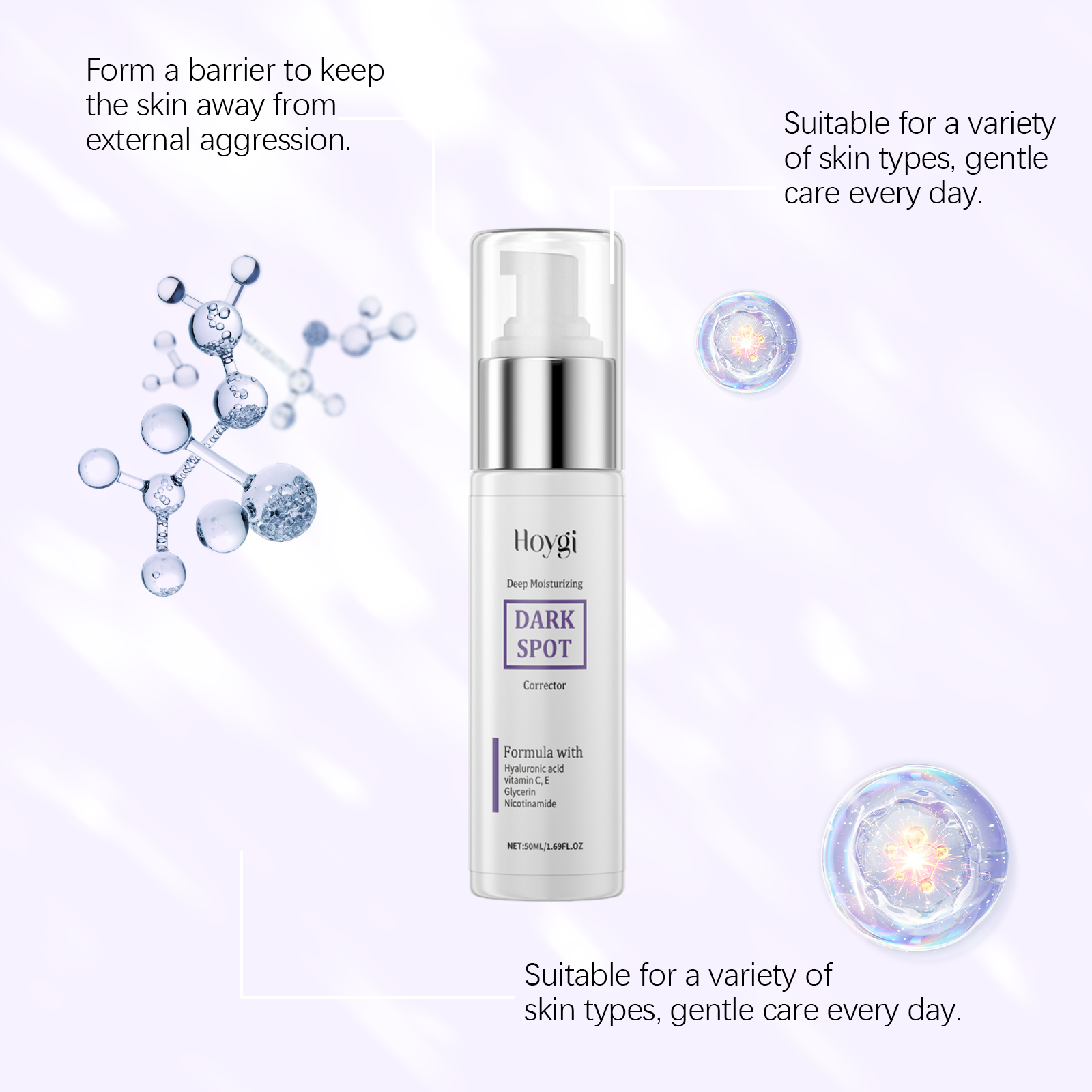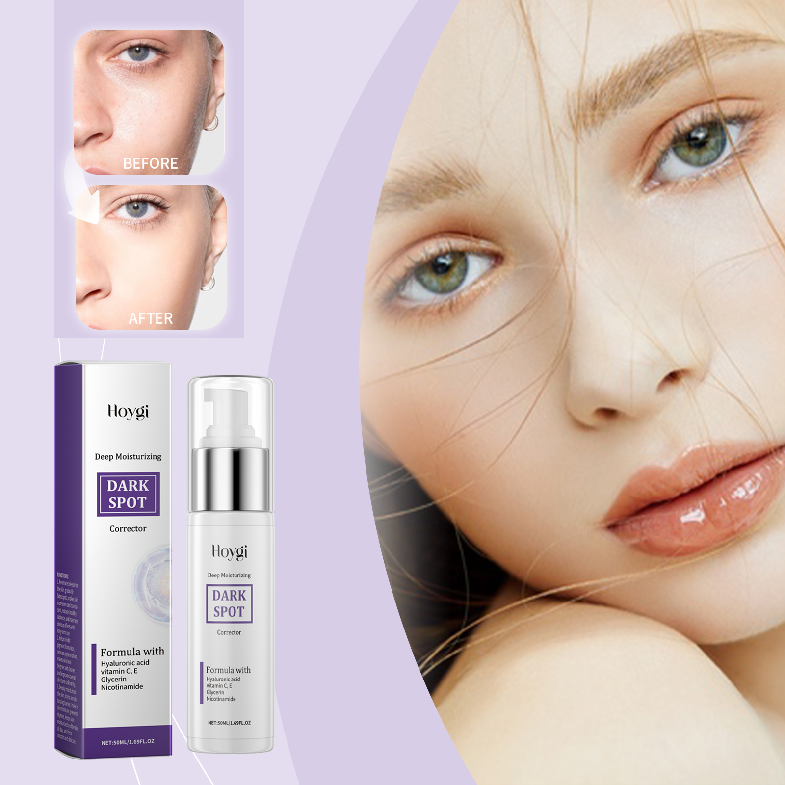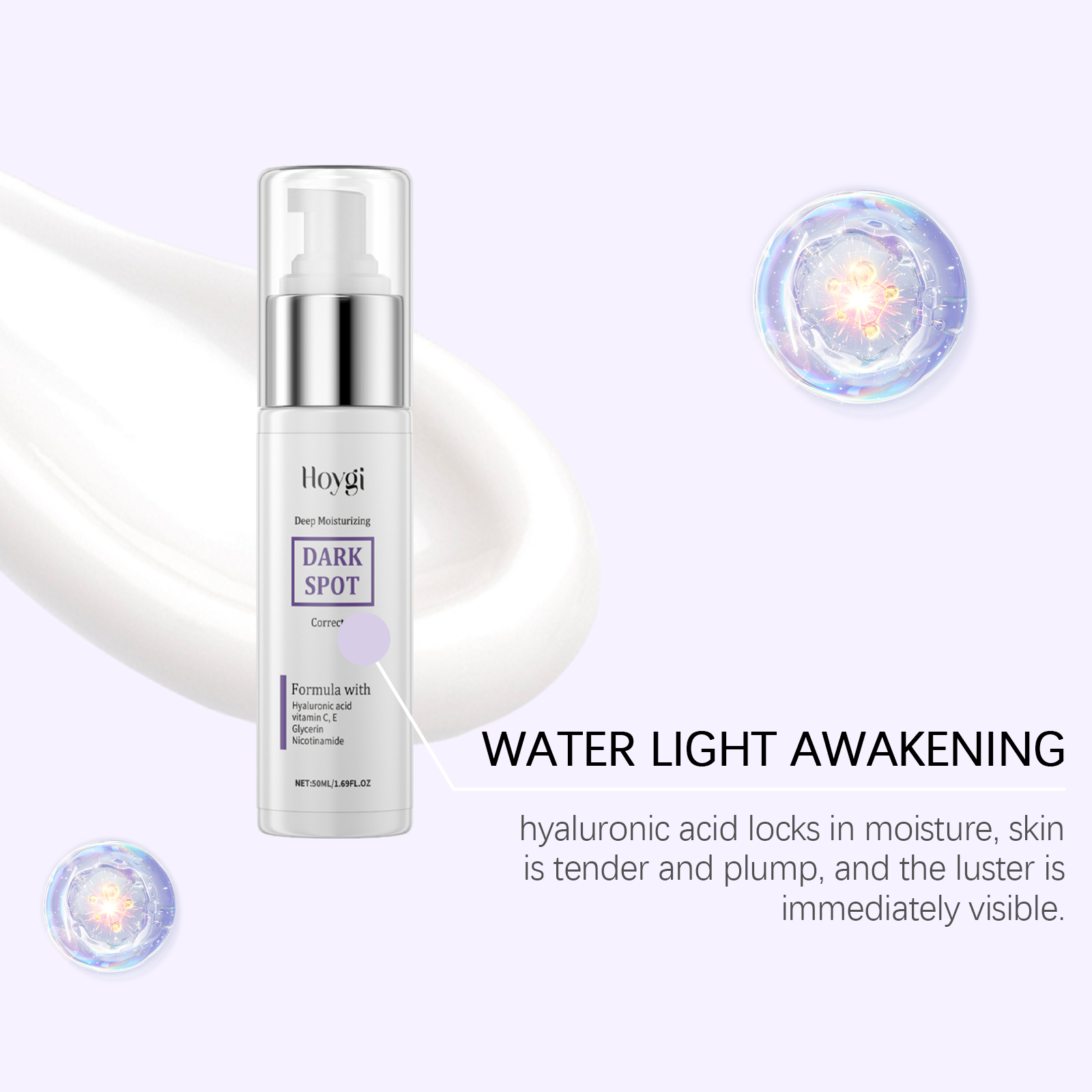 Our serum contains glycerin, hyaluronic acid, and vitamin C(ascorbic acid). It can lighten the whole white, uniform skin tone, high gloss. Activate skin vitality, bid farewell to fatigue and dullness. The way to use it is simple: 1. Clean your face and keep it dry. 2. Apply appropriate amount to face evenly. 3. Gently cycle the massage until it is completely absorbed. Dark spots gradually reduce, skin gradually smooth and flawless; Fade the traces of age, skin is delicate and smooth.