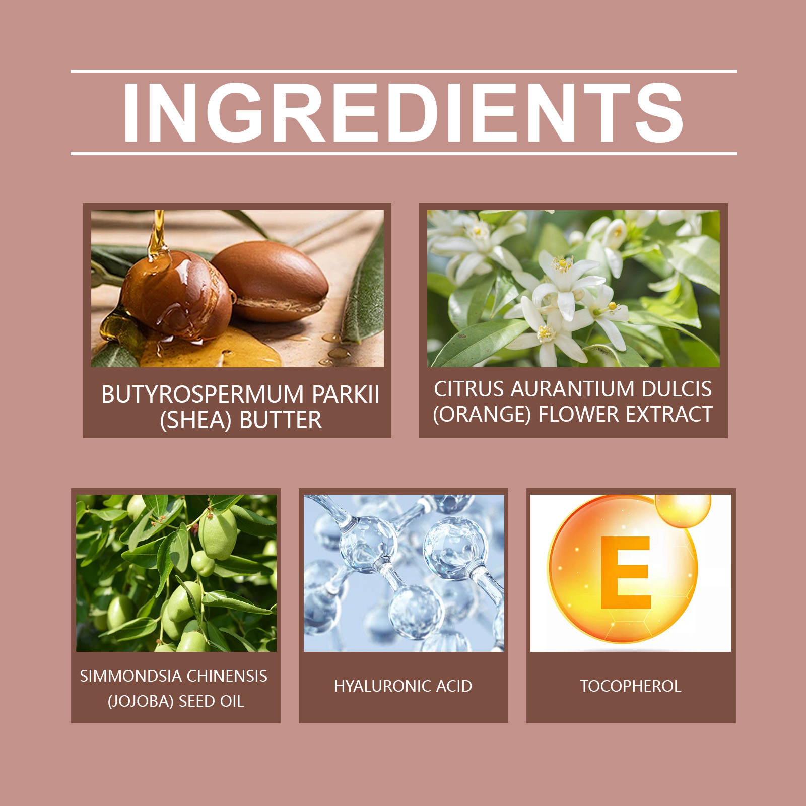 Our shea butter moisturizer contains shea butter, Jojoba seed oil and sweet orange blossom extract. It deeply nourishes the skin and keeps it healthy and moisturized. The way to use it is simple: 1. Clean your skin and keep it dry. 2. Apply appropriate amount to skin evenly. 3. Massage gently in circular motions to promote absorption. Multiple moisturizing ingredients effectively lock skin moisture, keep skin moist for a long time, and prevent skin from discomfort due to lack of water.