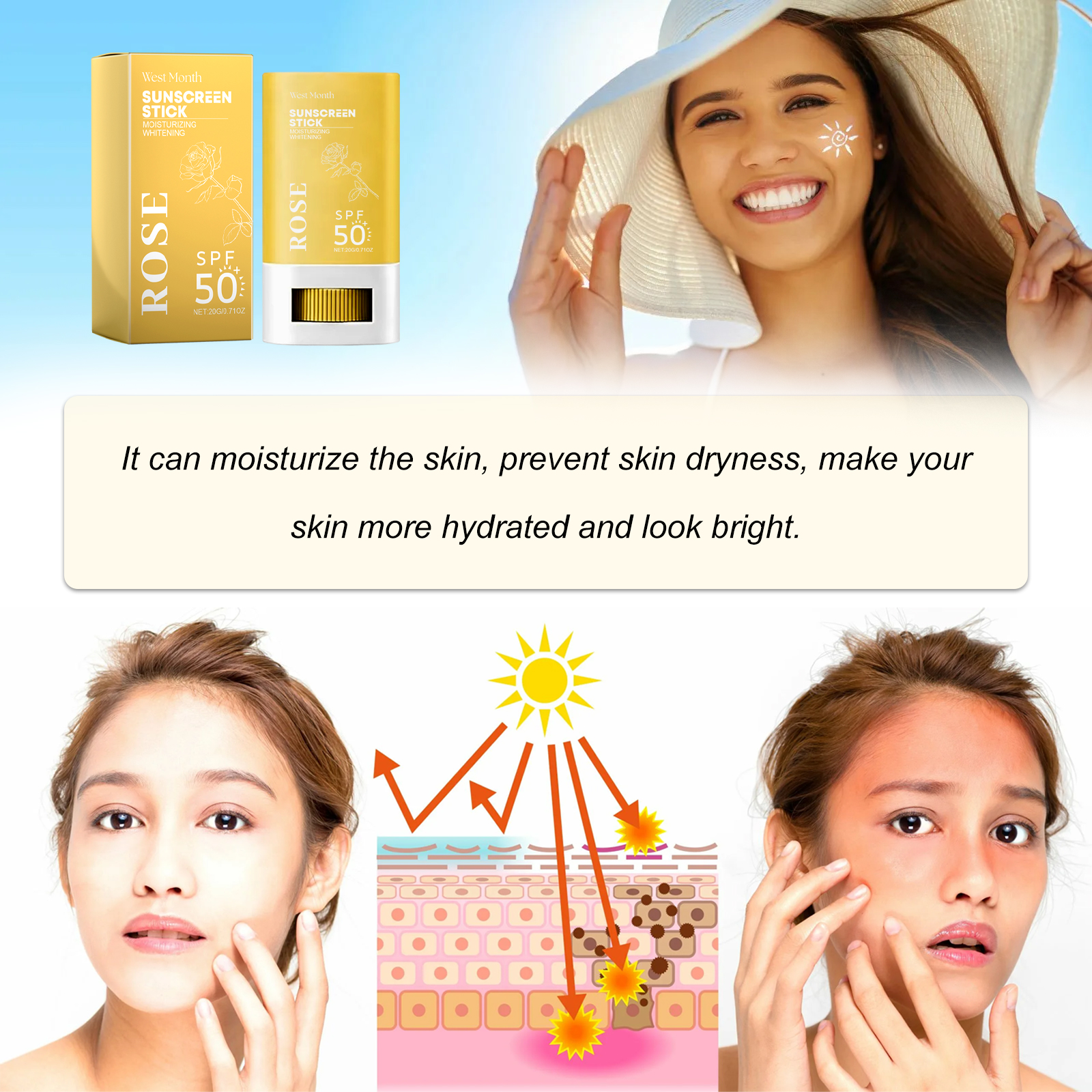 Our Sunscreen Stick contains Rosa Damascena Flower Extract, Glycerin, Titaniuma Dioxide. It prevents UV damage to the skin and forms an invisible skin barrier on the skin to help keep it pale and protect your skin. Its application is simple: clean and dry the skin, and apply the product evenly to the desired area. Can reflect ultraviolet light, absorb and filter ultraviolet light, full-wavelength protection, multi-directional protection of ultraviolet radiation.