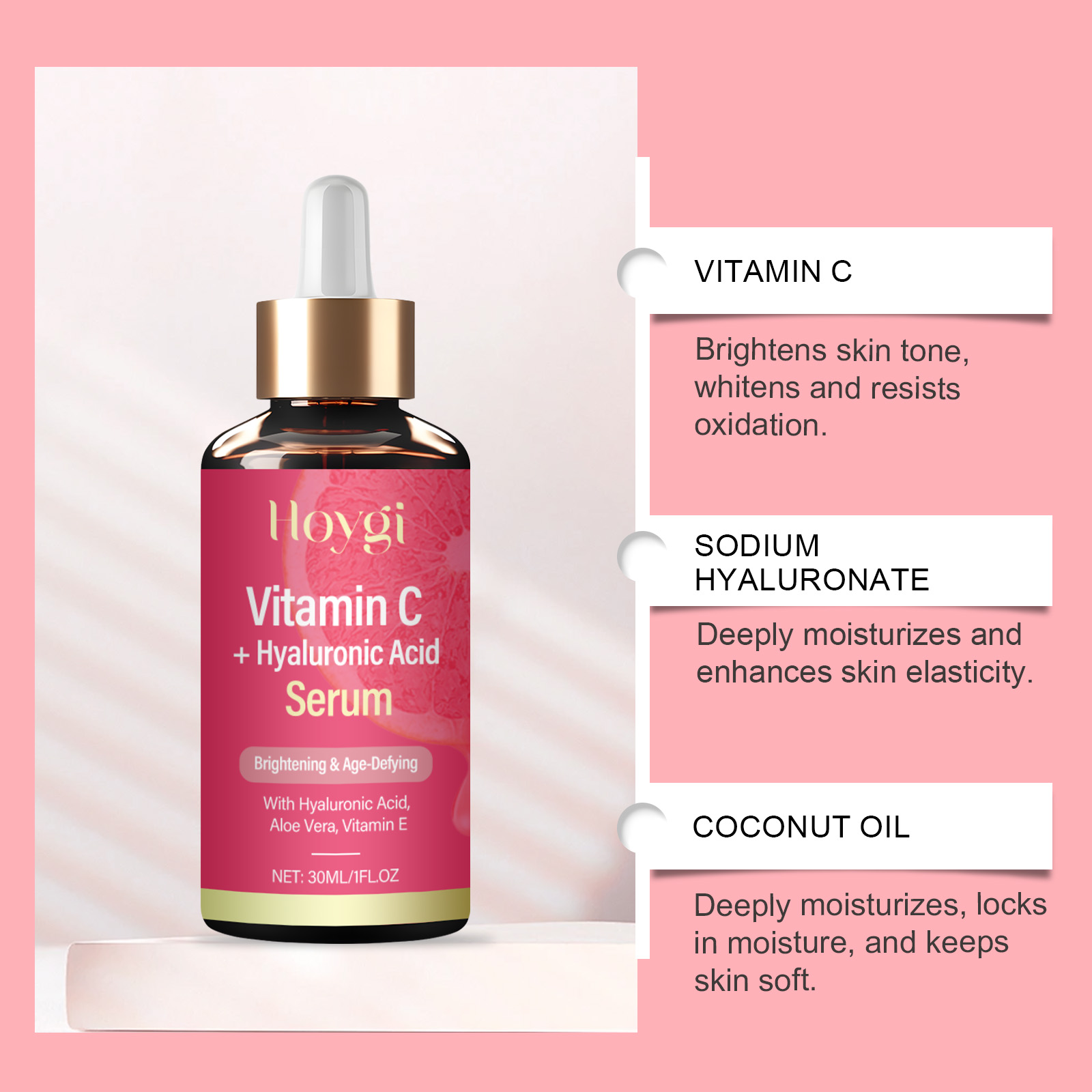 Our Vitamin C serum contains vitamin C, coconut oil, and hyaluronic acid. It can contain vitamin C, can effectively brighten the skin tone, improve dull. Active ingredients help to lighten dark spots and dullness and restore even radiance to the skin. The way to use it is simple: clean your face. Apply appropriate amount to face evenly. Massage gently in circular motions to promote absorption. And can be gently formulated to suit all skin types, including sensitive skin, for a comfortable care experience.