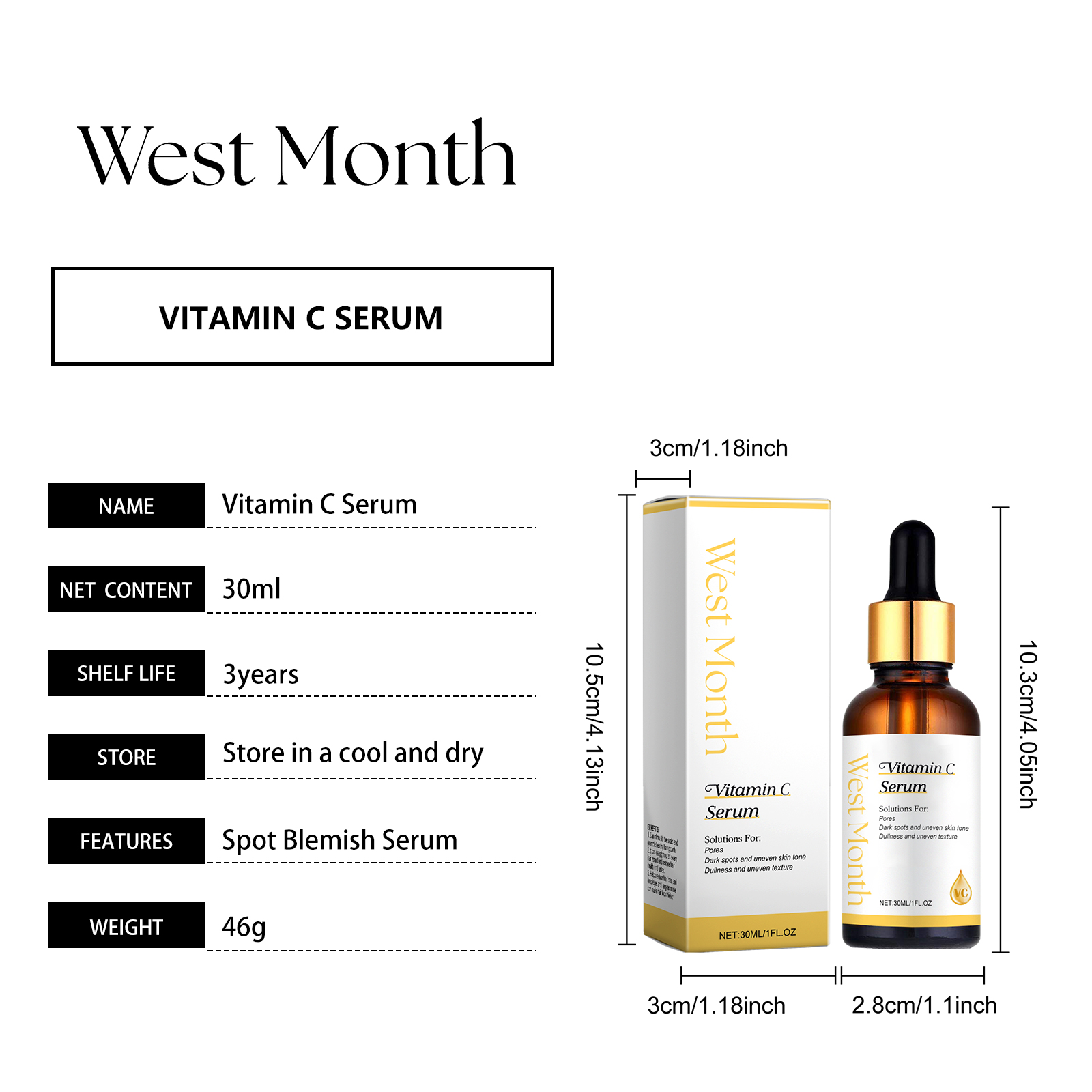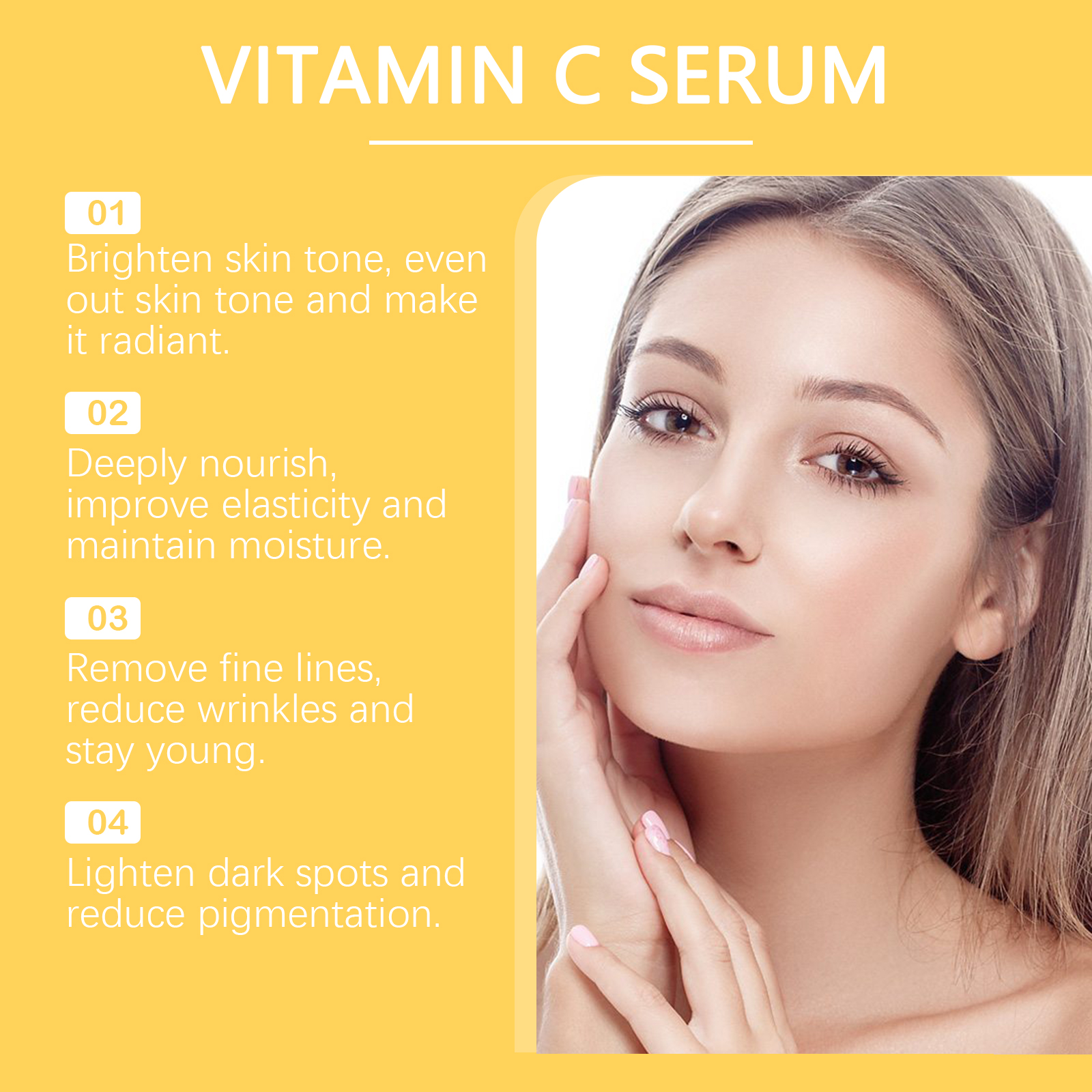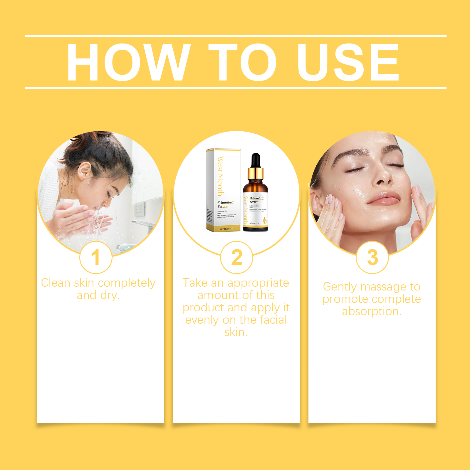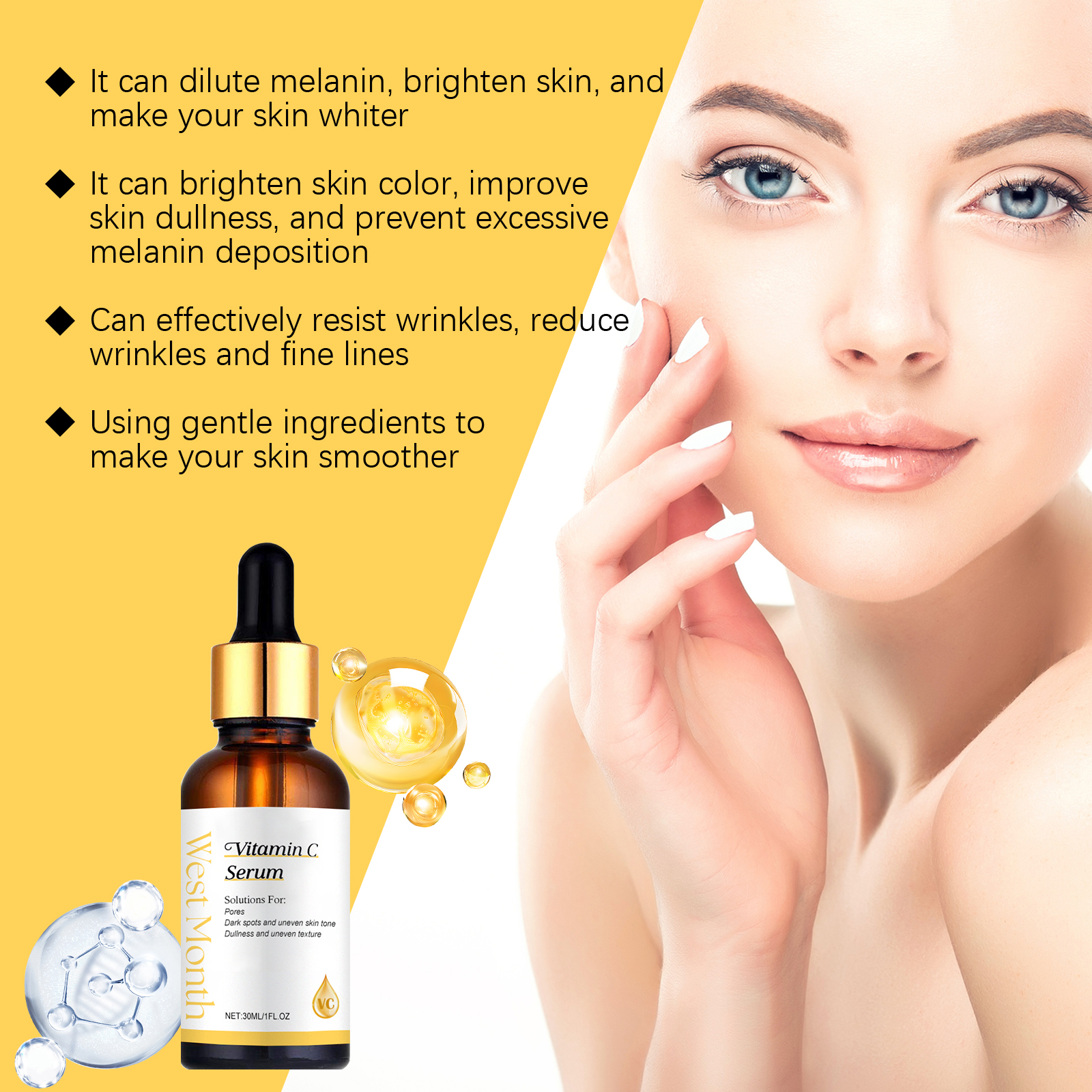 Our Vitamin C dark spot whitening serum contains tocopherol and arbutin. It strongly locks in moisture, preventing moisture loss and keeping skin soft. Smooth skin, reduce redness and allergic reactions. Its application is simple: thoroughly clean the skin and dry it. Apply appropriate amount of this product evenly on the face. Massage gently to promote complete absorption. It can also improve the problem of enlarged pores and make the skin more delicate and firm.