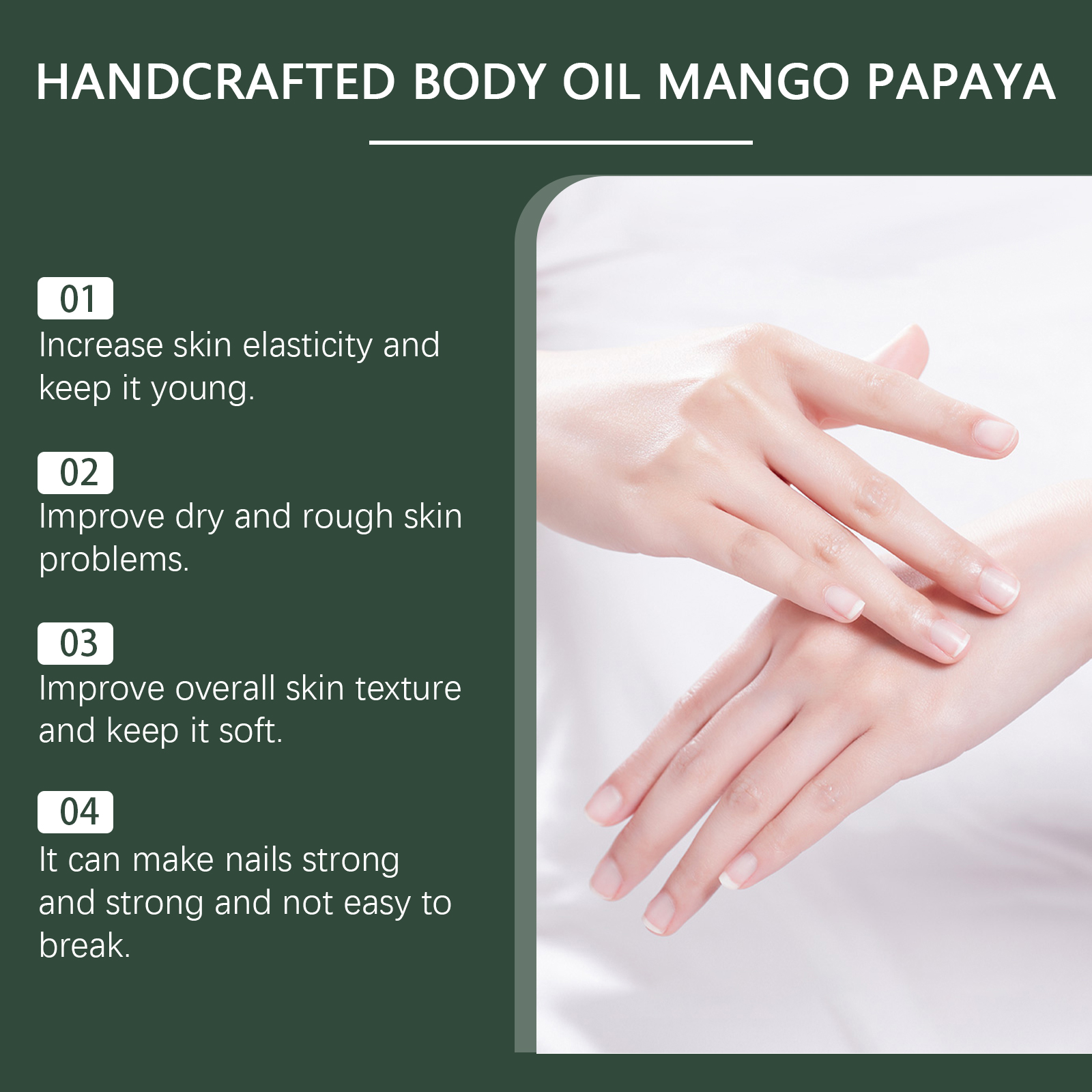 Our handmade papaya and Mango body oil contains Jojoba seed oil and sweet almond oil. It can help condition and tighten the skin, making it look firmer and younger. It provides moisture to the skin and keeps it hydrated. Its use is very simple: Use as a hair care oil: first clean and blow dry the hair, take appropriate amount of this product evenly apply to the scalp and hair, massage gently with fingertips to promote absorption. Used as body oil: can be mixed with body lotion and applied to the whole body after bathing. Use as a nail protection oil: Clean your nails thoroughly first, apply this product directly to your nails, and wait for absorption. And it can be used all over the body to nourish.