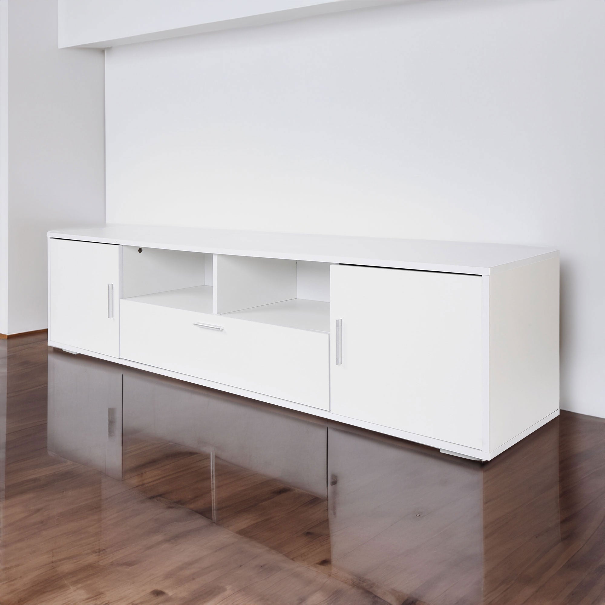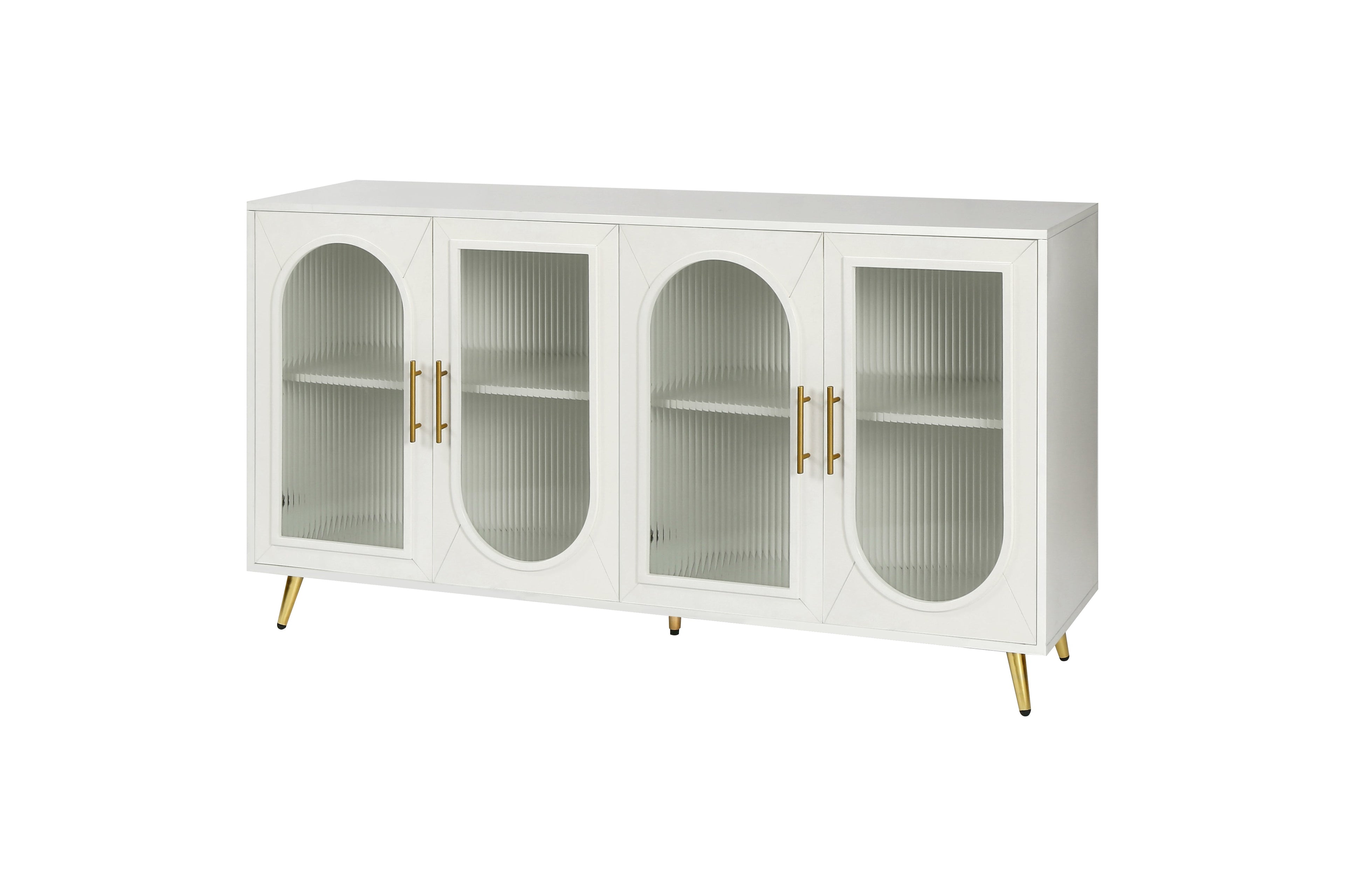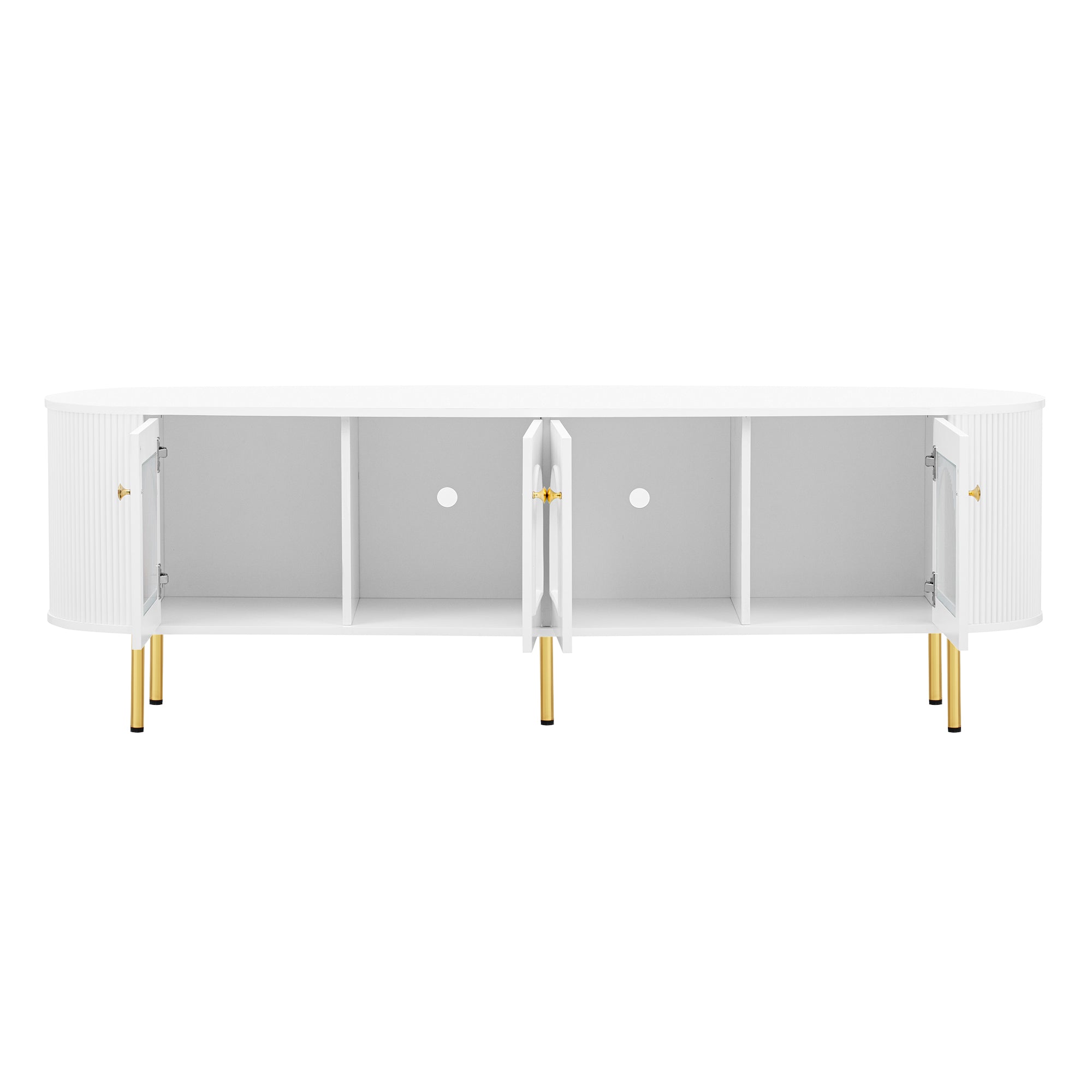 U-Can Modern TV Stand for TVs up to 80 Inches, Entertainment Center with 4 Cabinets, Wood with Metal Legs and Handles White -