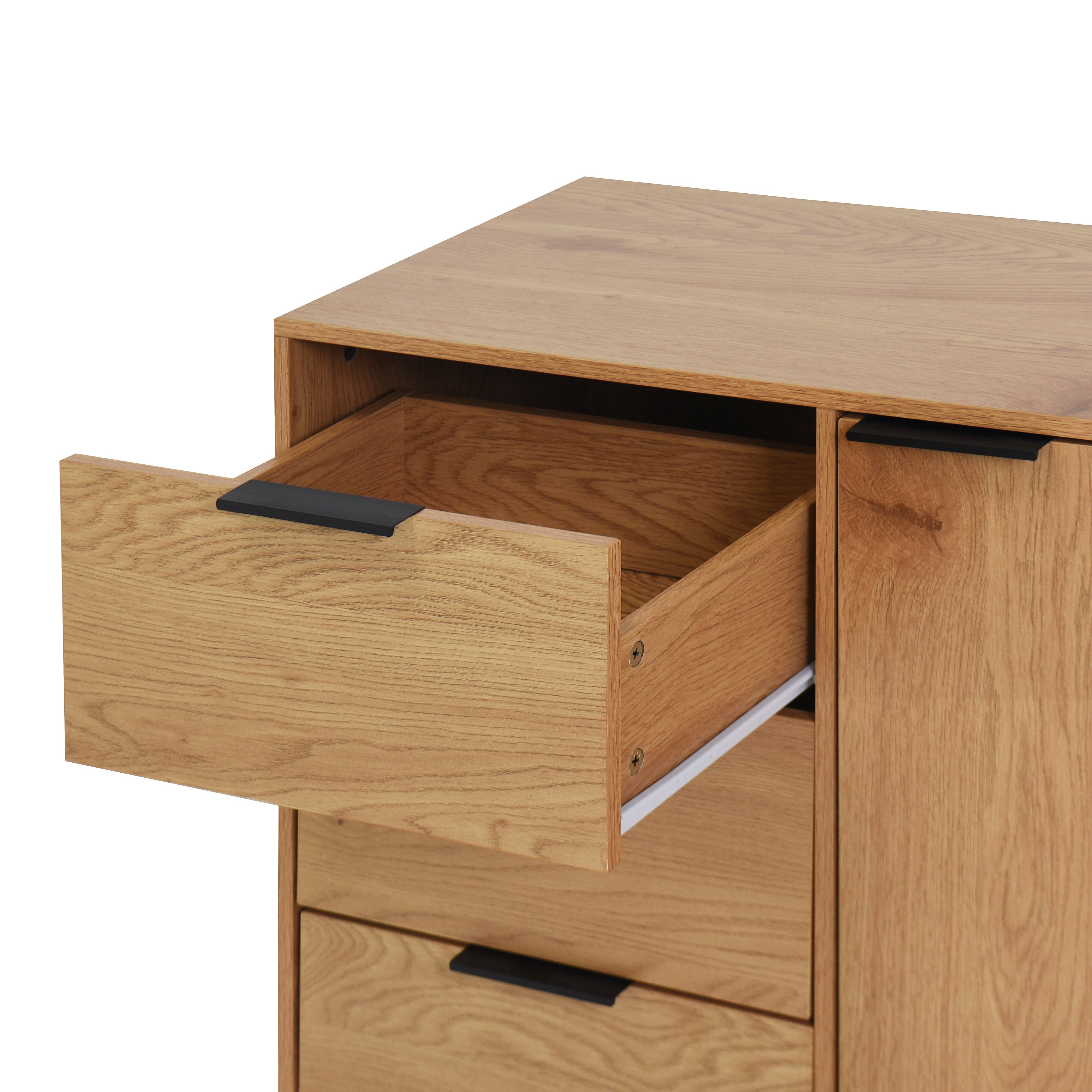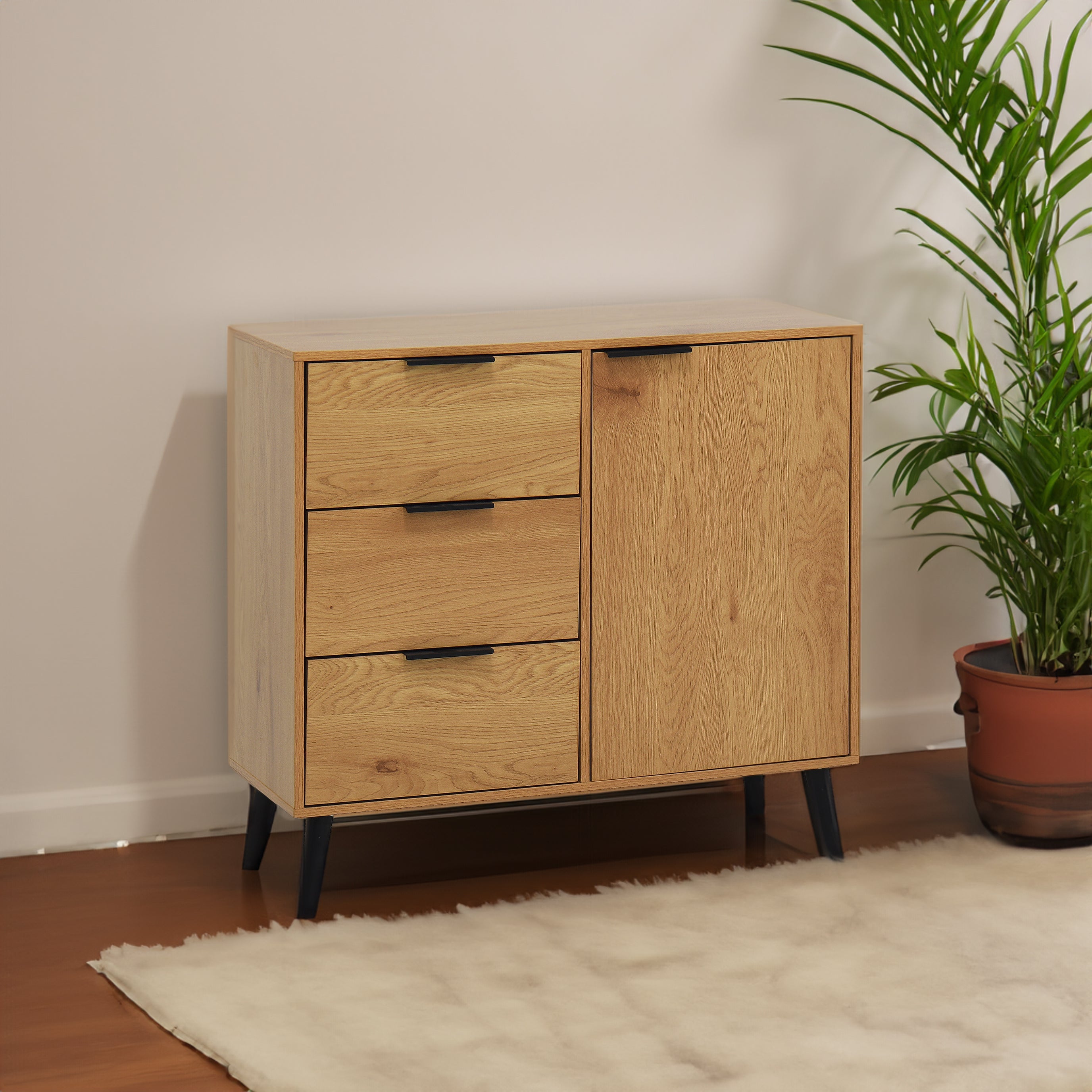 Storage cabinet with 3 drawers and adjustable shelves, medieval cabinet with doors in natural wood color -